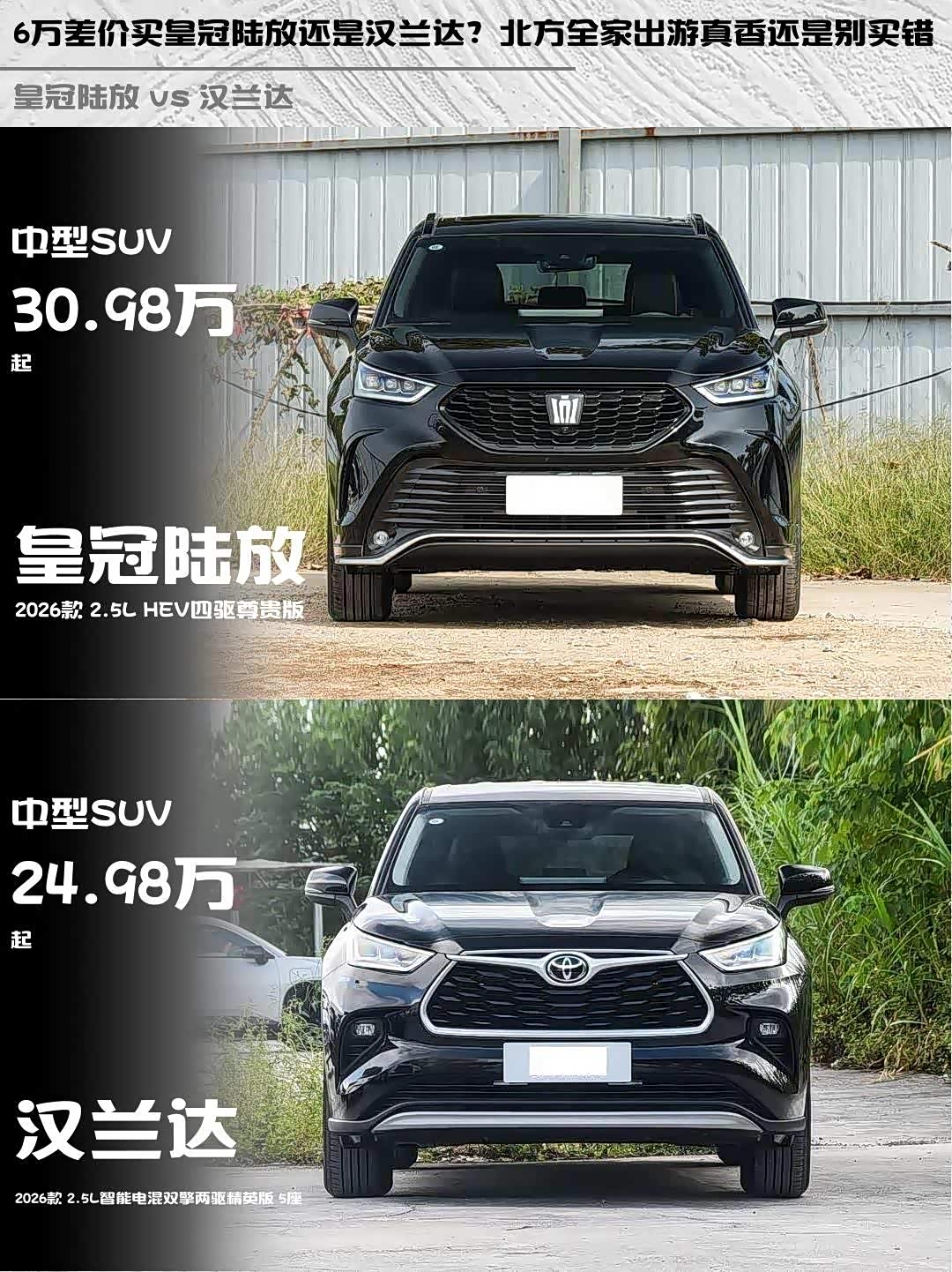 最近后台好多朋友在问 皇冠陆放(参数|询价)和汉兰达怎么选,作为两款丰田系的中型SUV,确实容易让人纠结。今天就来深度对比2026款皇冠陆放2.5L HEV四驱尊贵版和汉兰达2.5L智能电混双擎两驱精英版5座,看完你就知道哪款更适合你!🔥