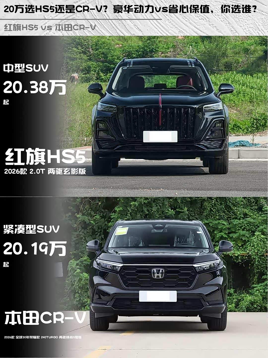 车家号·0浏览·2026-02-18 08:32 · 北京最近在选20万级SUV的朋友看过来!红旗HS5 2026款 2.0T两驱玄影版和 本田CR-V(参数|询价) 2026款两驱锋尚5座版深度对比,看完这篇你就知道怎么选了!🔥
