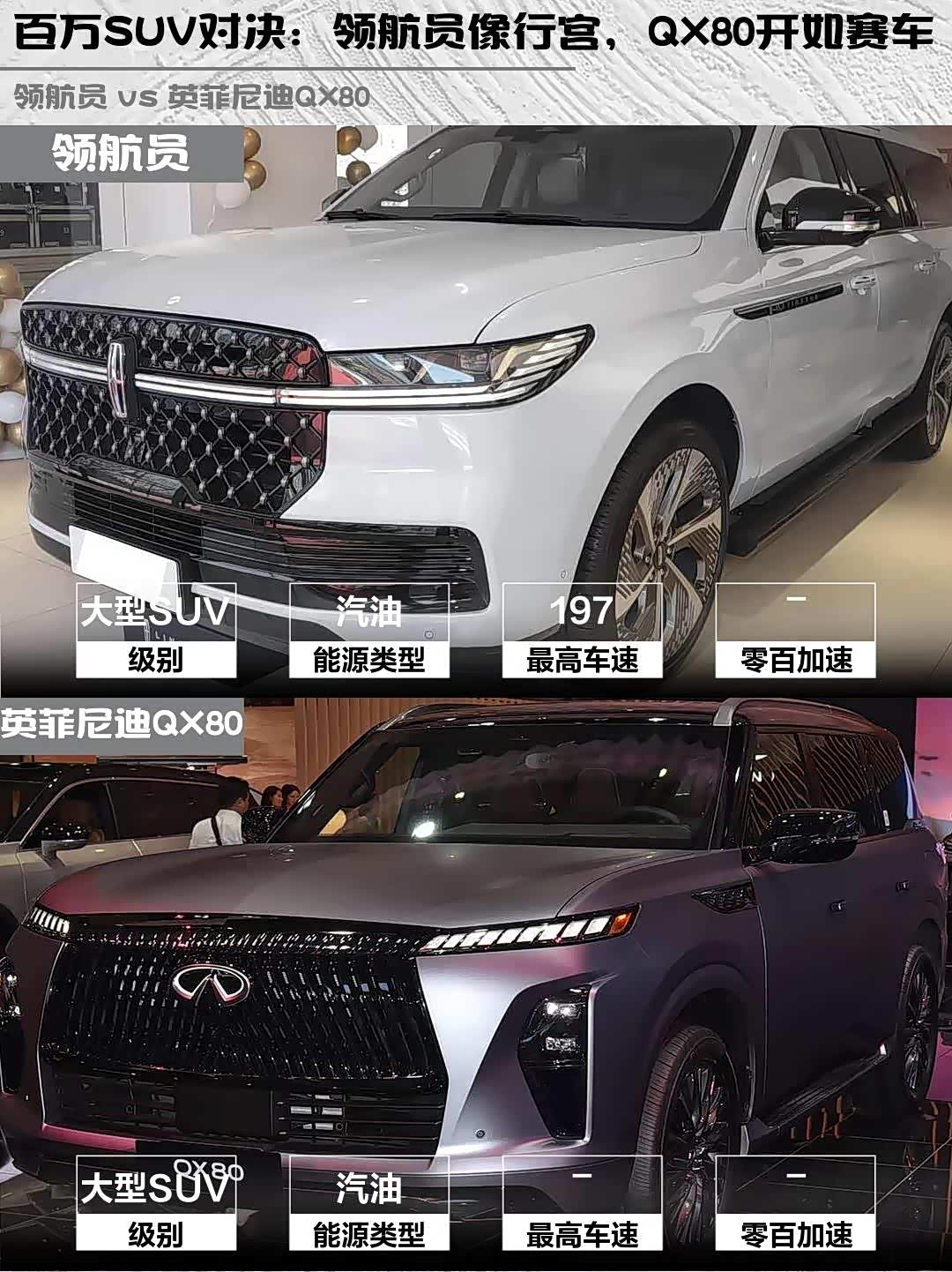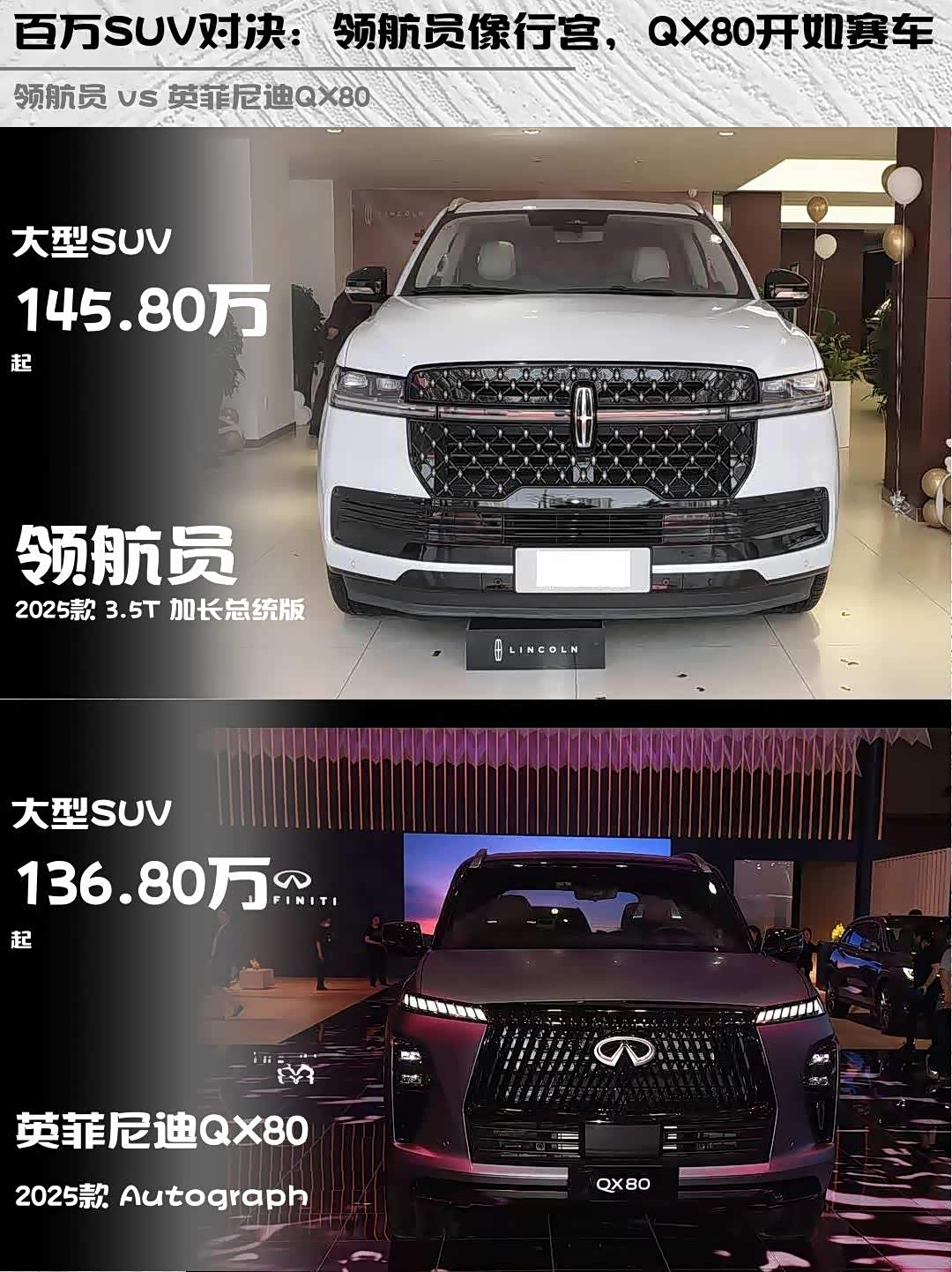 最近在纠结百万级豪华SUV选哪款?今天深度对比林肯领航员 2025款 3.5T 加长总统版和 英菲尼迪QX80(参数|询价) 2025款 Autograph,看完这篇你就懂了!💡