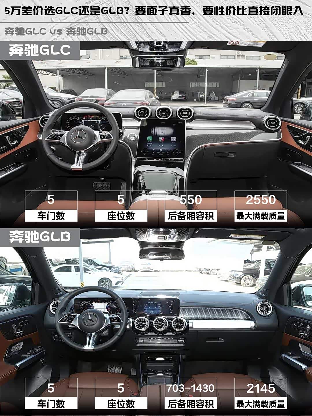 要面子选GLC,要性价比选GLB。如果经常满载出行,GLC的后排舒适性明显更好;如果是小家庭日常使用,GLB的空间和价格更有优势。