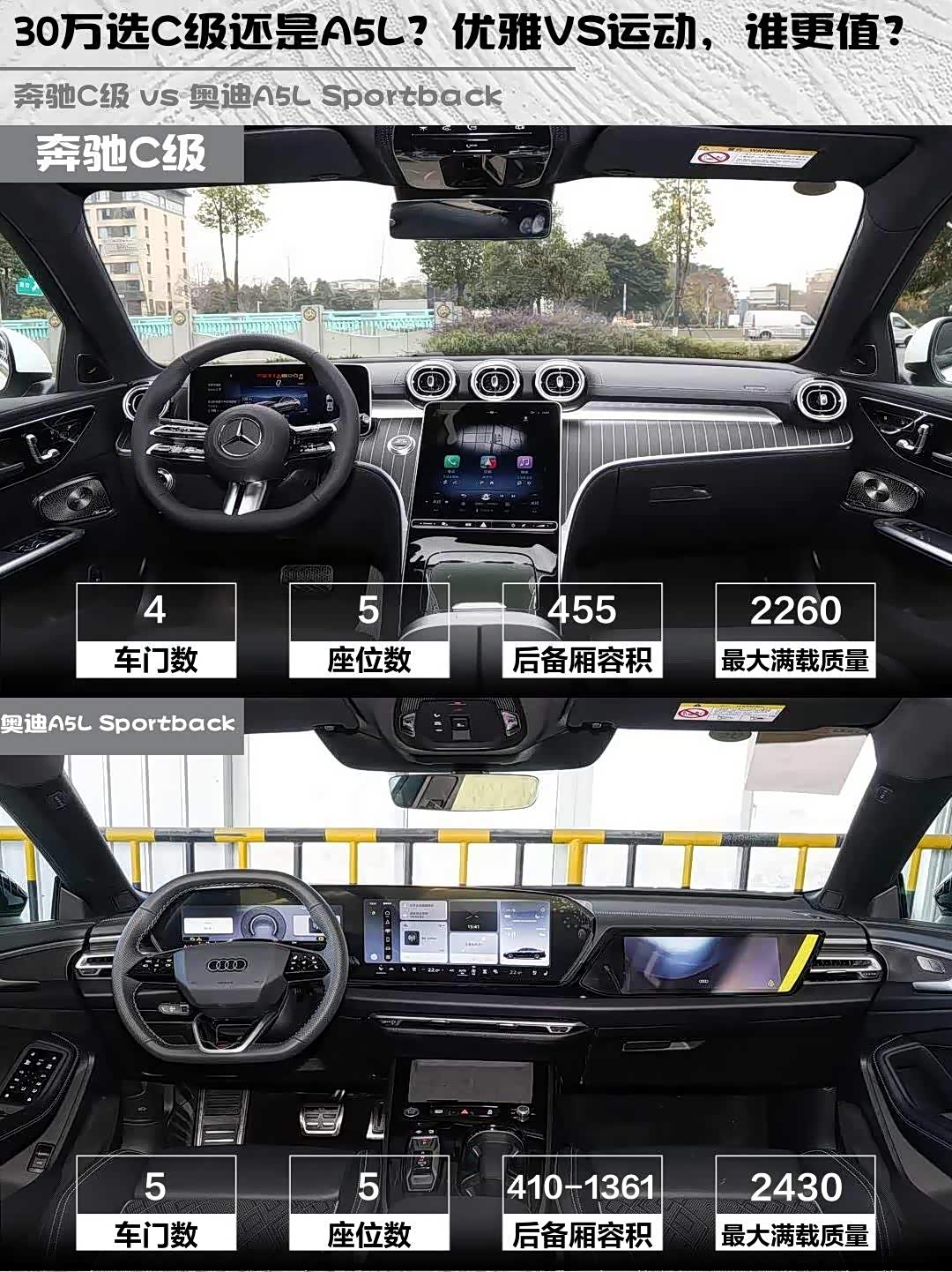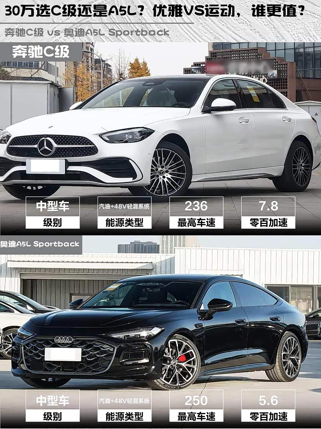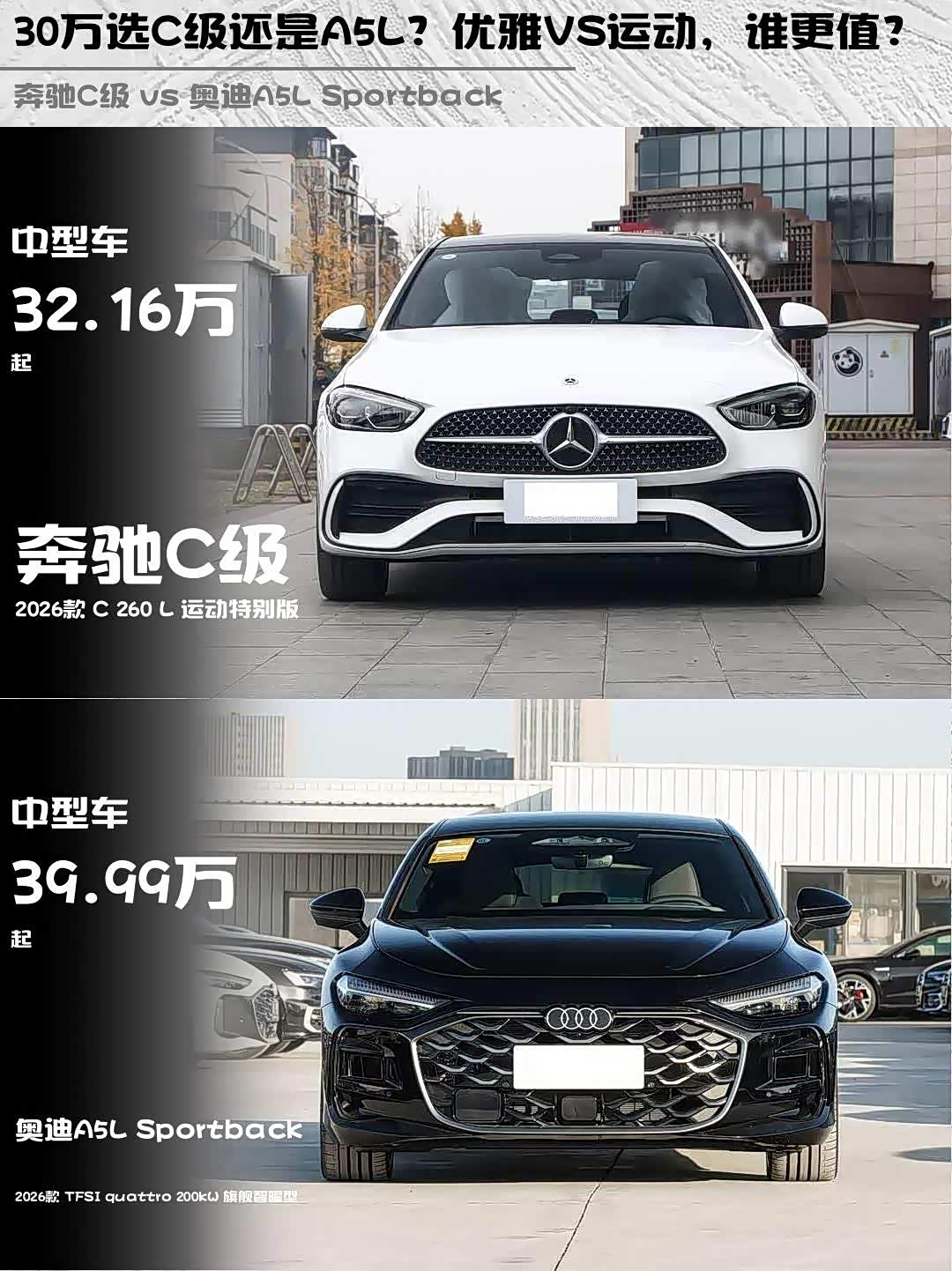 奔驰C级2026款C 260 L运动特别版 vs 奥迪A5L Sportback(参数|询价) 2026款TFSI quattro旗舰智曜型,30万级豪华轿车怎么选?🤔