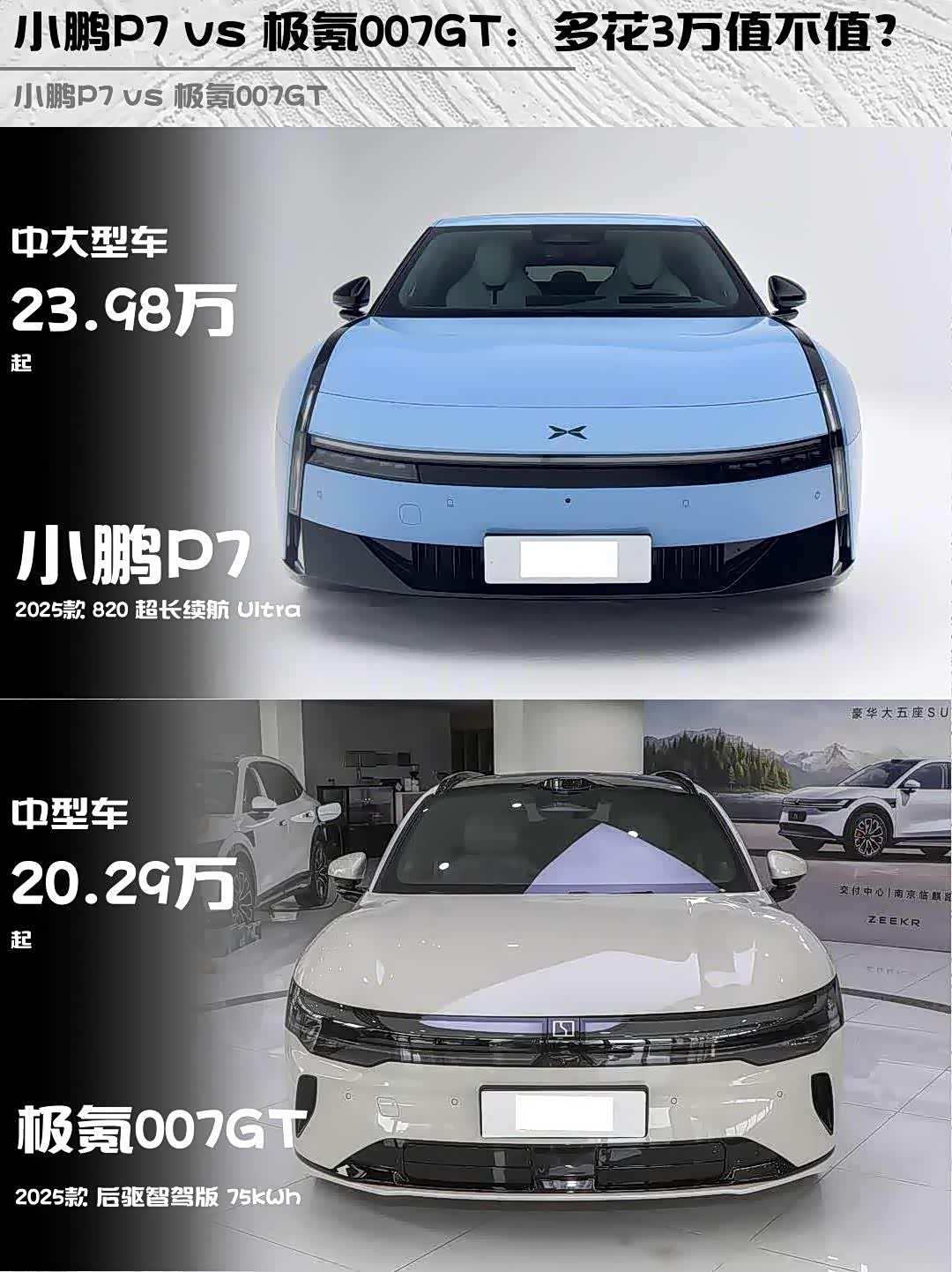 最近在选车的小伙伴看过来!今天给大家深度对比两款25万级纯电轿跑——小鹏P7 2025款 820 超长续航 Ultra和 极氪007GT(参数|询价) 2025款 后驱智驾版 75kWh,实测干货直接上菜!🍽️