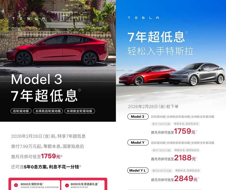 先说最硬的一刀——金融方案。2月28日前下单,Model 3后驱/长续后驱/长续全驱三款车型,首付7.99万起,7年超低息月供低至1759元,还能再拿8000元保险补贴。年化费率0.5%,折合年化利率0.98%,贷15万七年利息才五千多。什么概念?你存余额宝的年化都比这高。嫌七年太长?5年0息方案也摆在那儿,任选。