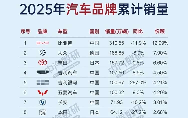 大众汽车,合资里的“老大哥”,2025年销量为190.2万辆,同比下滑7.8%,燃油车占中国市场份额超 16% ,还是燃油车一哥、合资销冠,新能源表现相对疲软,同比下滑约 40%。