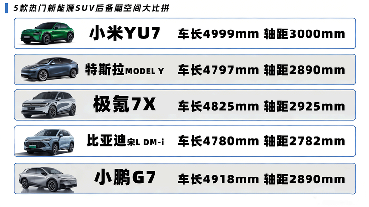 春节自驾出行,后备厢的“肚量”直接决定了出行体验——不仅要装下全家人的行李、年货礼盒,还要备上冬季应急的各种物品,一款“能装”的车才是春节出行的好搭档。中型SUV凭借兼顾操控与空间的优势,一直是新能源市场的热门选择,今天就为大家带来小米YU7、特斯拉Model Y、极氪7X、比亚迪宋L DM-i、小鹏G7五款热门新能源SUV的后备厢空间对比,看看谁才是春节出行的“装载王者”。