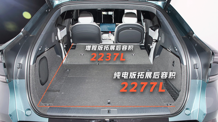 放倒二排后,拓展空间非常可观。纯电版最大拓展容积达2277L、增程版 2237L。形成的接近纯平超大储物平台,有网友实测称可容纳37个20英寸登机箱,即便是折叠推车、露营装备等大件物品也能从容收纳,完全满足多人口家庭春节自驾的高强度装载需求。