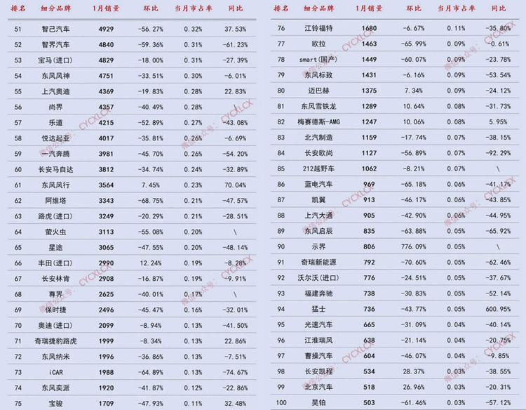 合资品牌在1月的表现呈现出“稳中有升”的特点。一汽-大众、一汽丰田、广汽丰田分别以73033辆、67117辆、61543辆位列第四、第五、第六,其中广汽丰田同比大涨18.36%,东风日产同比增长25.80%,华晨宝马、雷克萨斯等豪华品牌也实现同比正增长,显示出合资品牌在燃油车与豪华车市场的用户粘性依旧强劲。