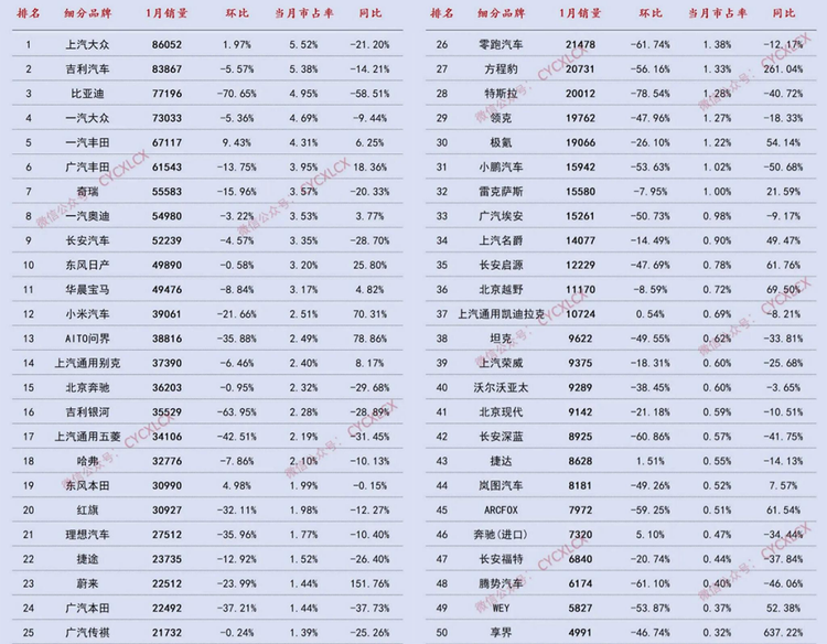 而此前长期领跑的比亚迪,1月销量仅77196辆,环比暴跌70.65%、同比下滑58.51%,市占率滑落至4.95%,阶段性调整态势明显,也让自主头部的竞争格局迎来新变数。