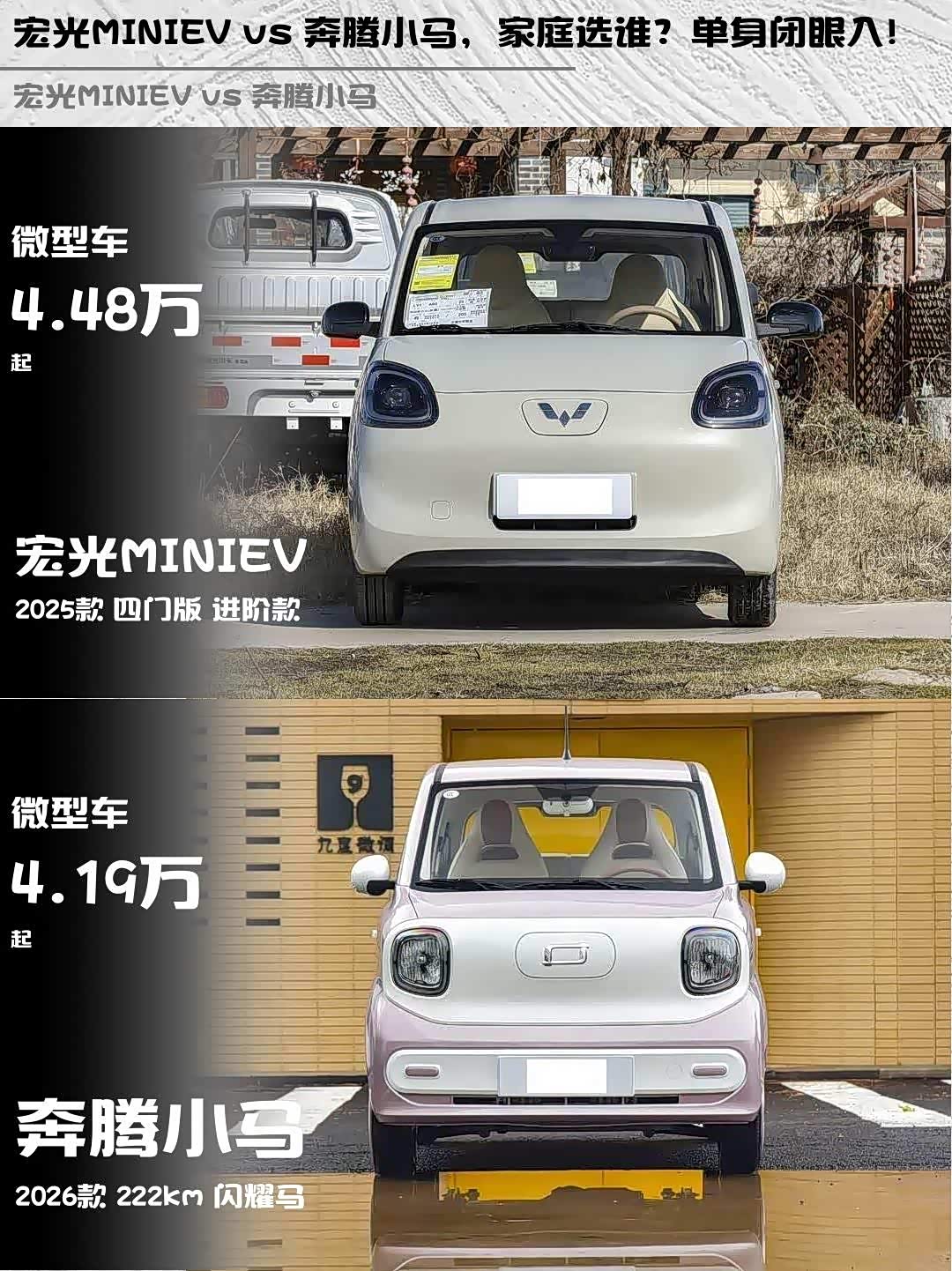 最近在纠结4万级纯电小车怎么选? 宏光MINIEV(参数|询价) 2025款四门版进阶款和奔腾小马2026款222km闪耀马深度对比来啦!这两台车我都试驾过,优缺点直接摊开说👇