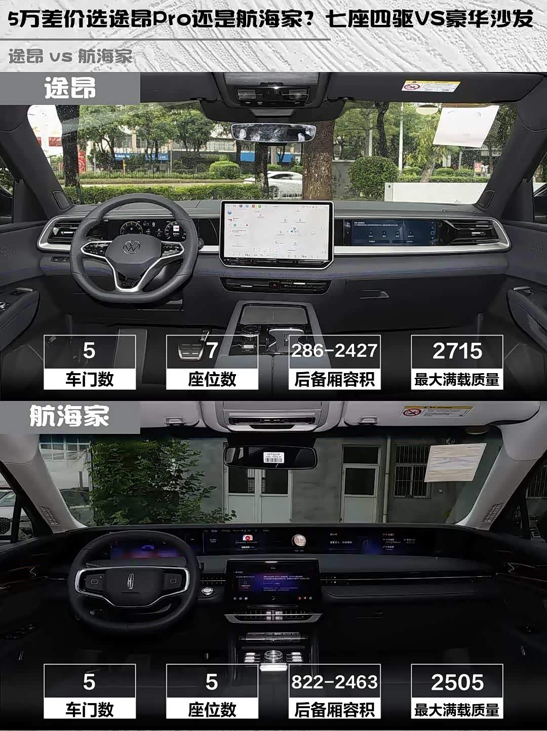 最后说价格:途昂Pro四驱登峰版35.99万,航海家启航版30.58万。5万差价主要差在四驱系统和座椅数量上,就看你觉得值不值啦!