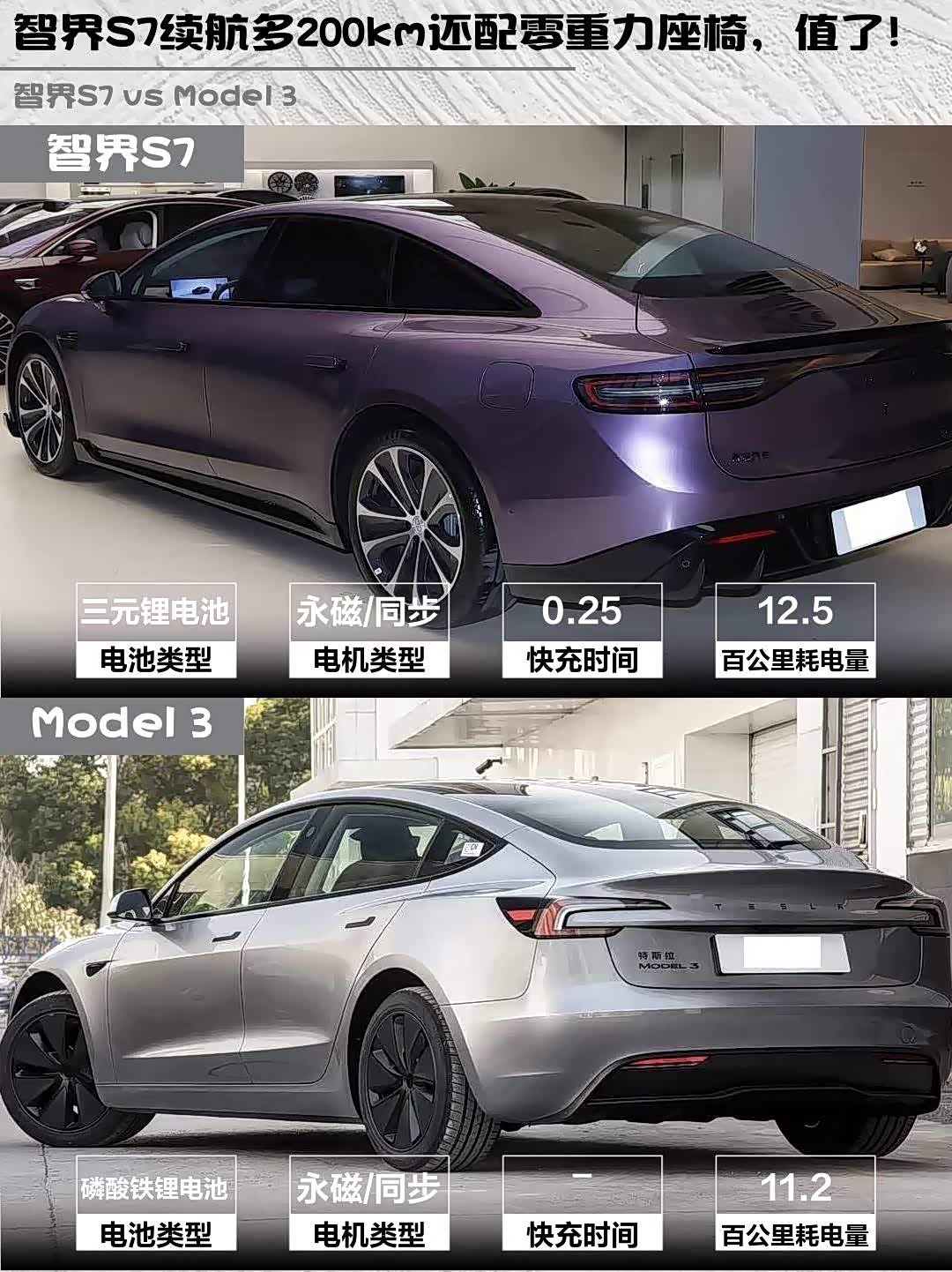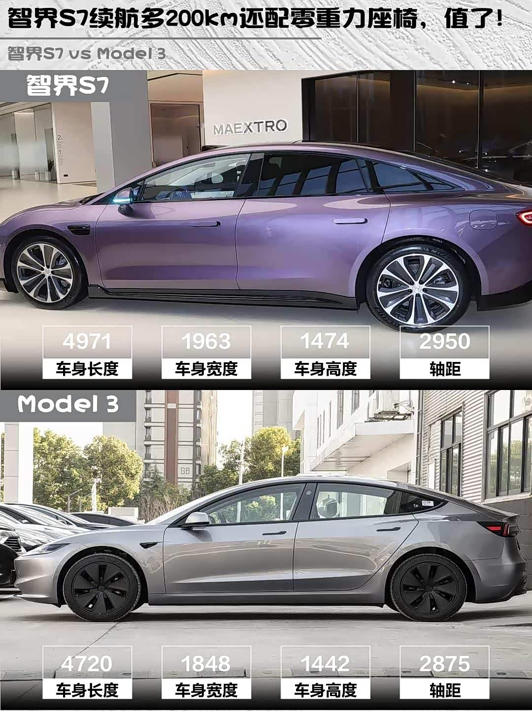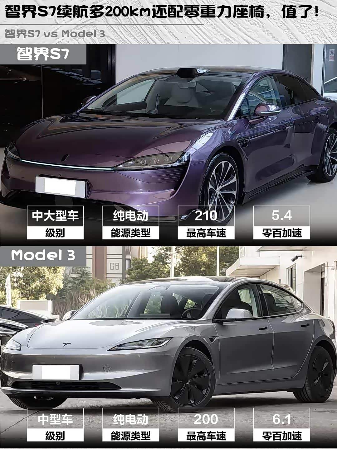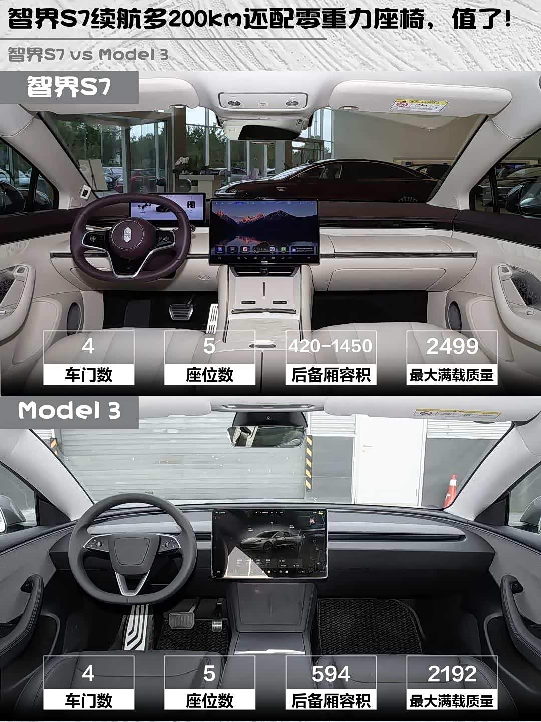 价格上两款车只差1万多,智界S7 Max+ 24.98万比Model 3后驱版23.55万略高,但多了空悬、零重力座椅这些越级配置。不过特斯拉的品牌溢价和超充网络也是实打实的优势。💵