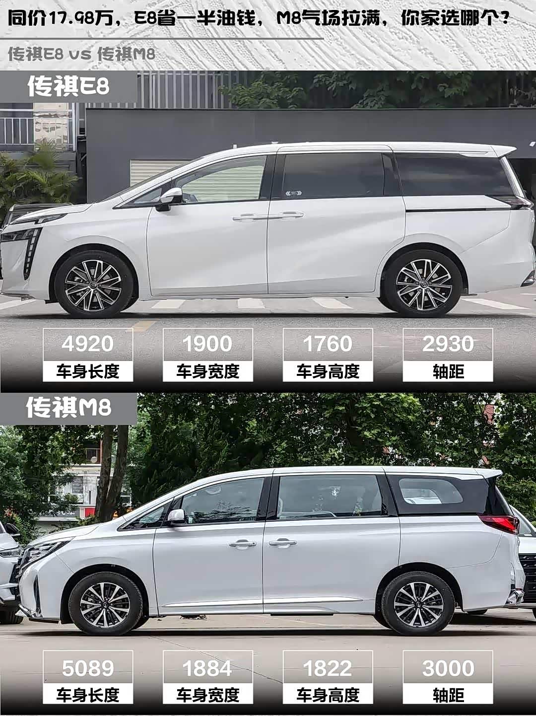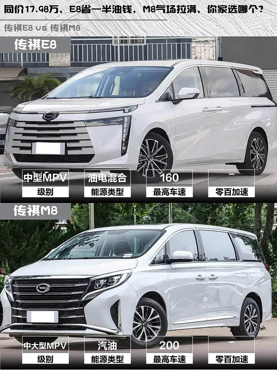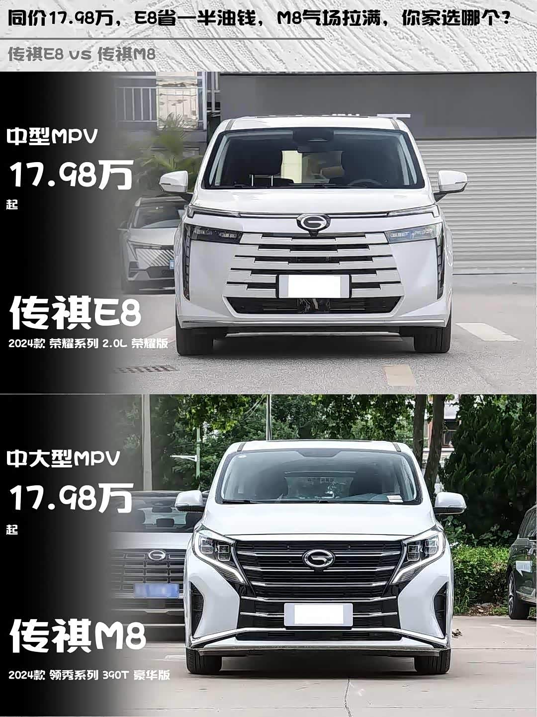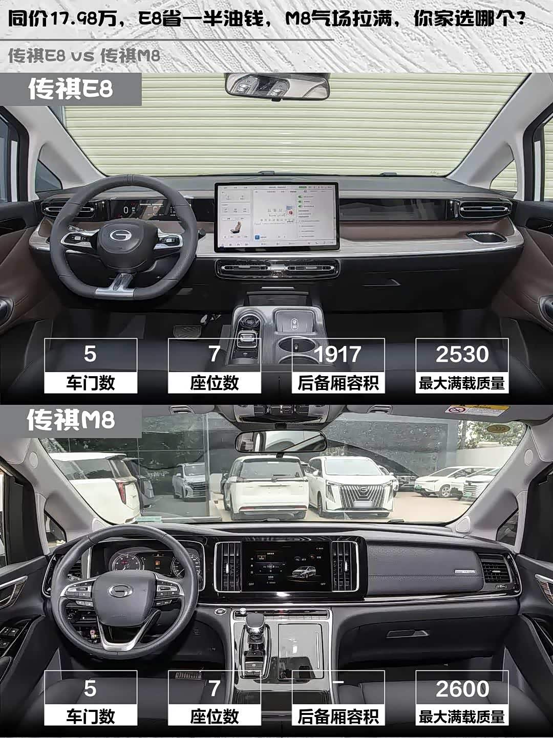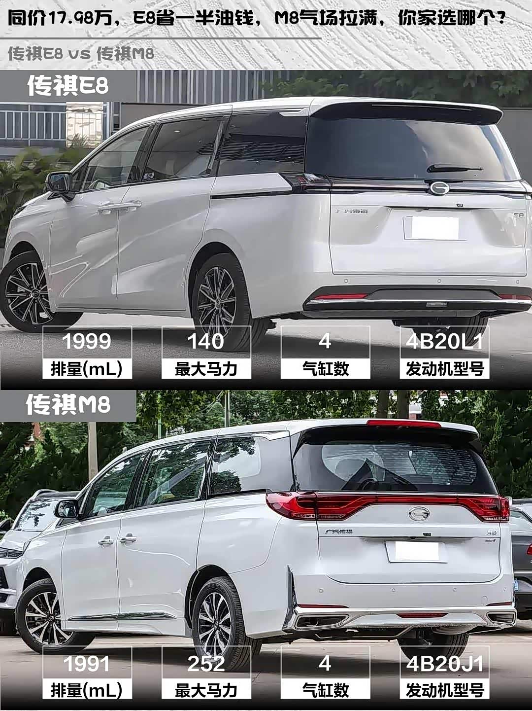 车家号·0浏览·2026-02-19 08:42 · 北京最近在选家用MPV的朋友看过来! 传祺E8(参数|询价) 2024款 荣耀系列 2.0L 荣耀版和传祺M8 2024款 领秀系列 390T 豪华版,两款都是17.98万价位,但性格完全不同,实测对比帮你避坑💡