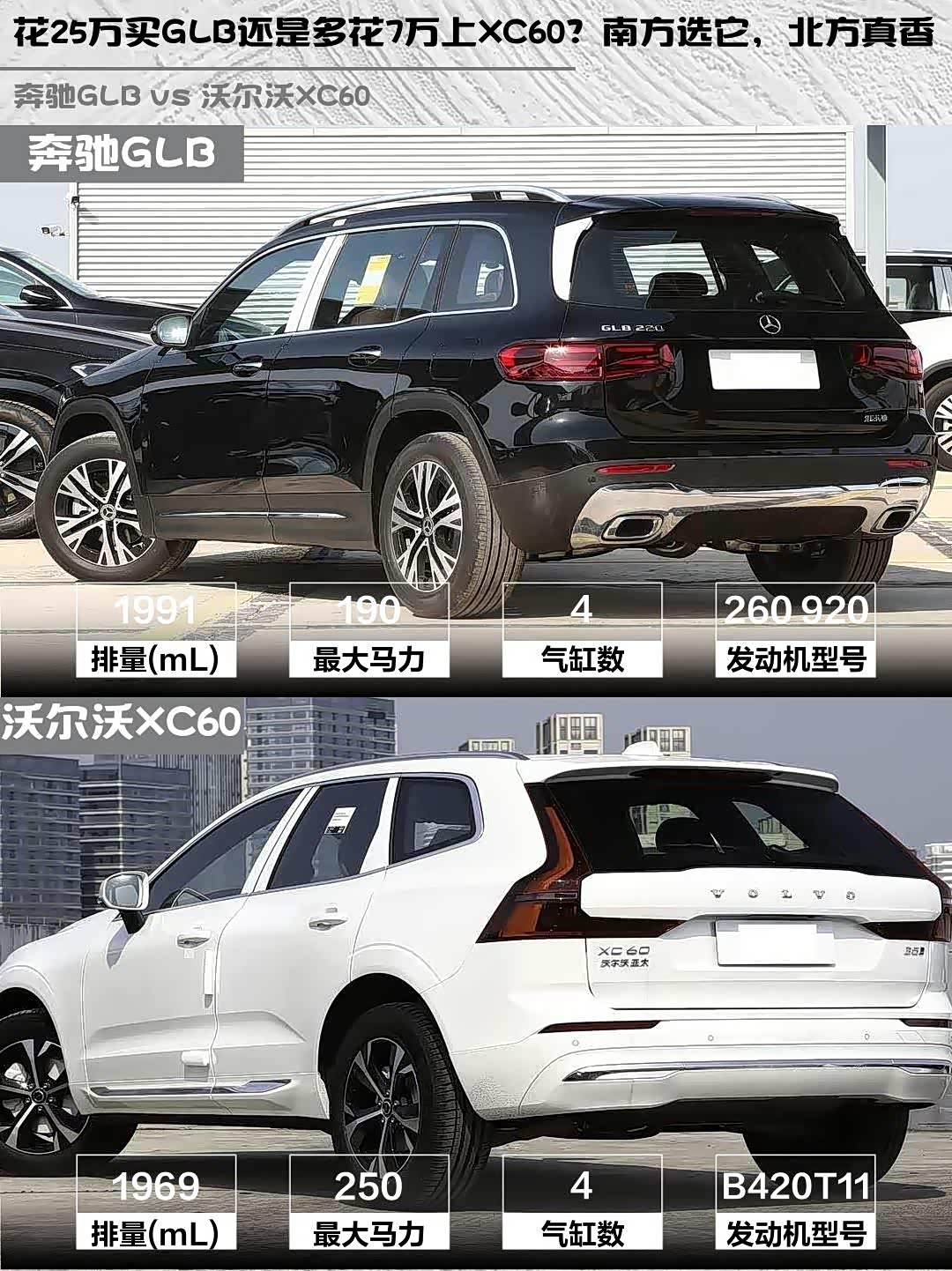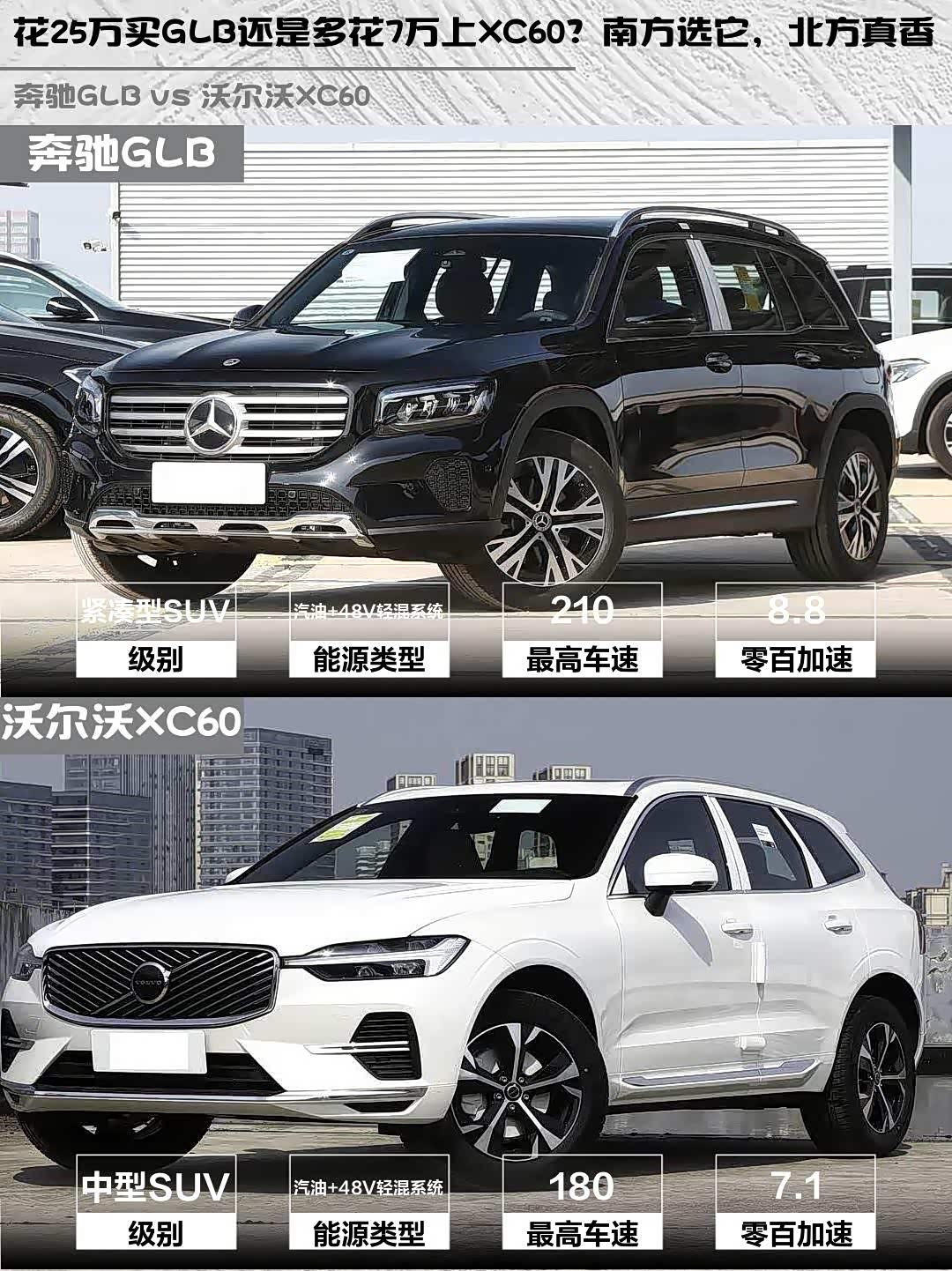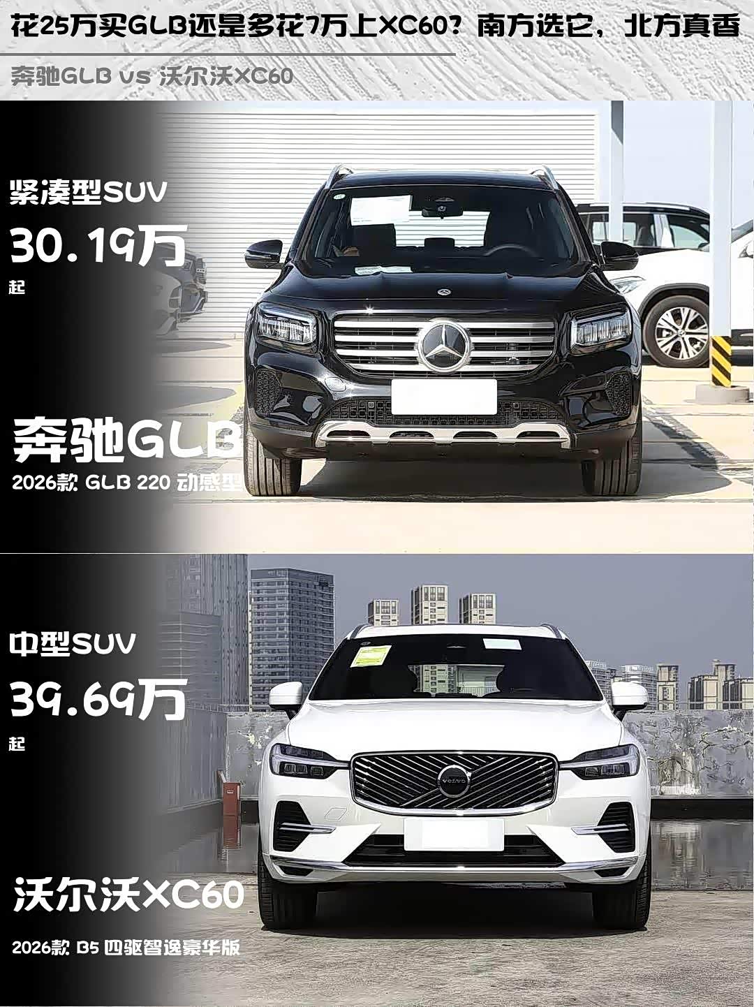 GLB 220动感型指导价30.19万,终端优惠后25万左右能落地;XC60智逸豪华版指导价39.69万,实际成交价约32万。虽然XC60贵些,但标配四驱和更多主动安全配置。
