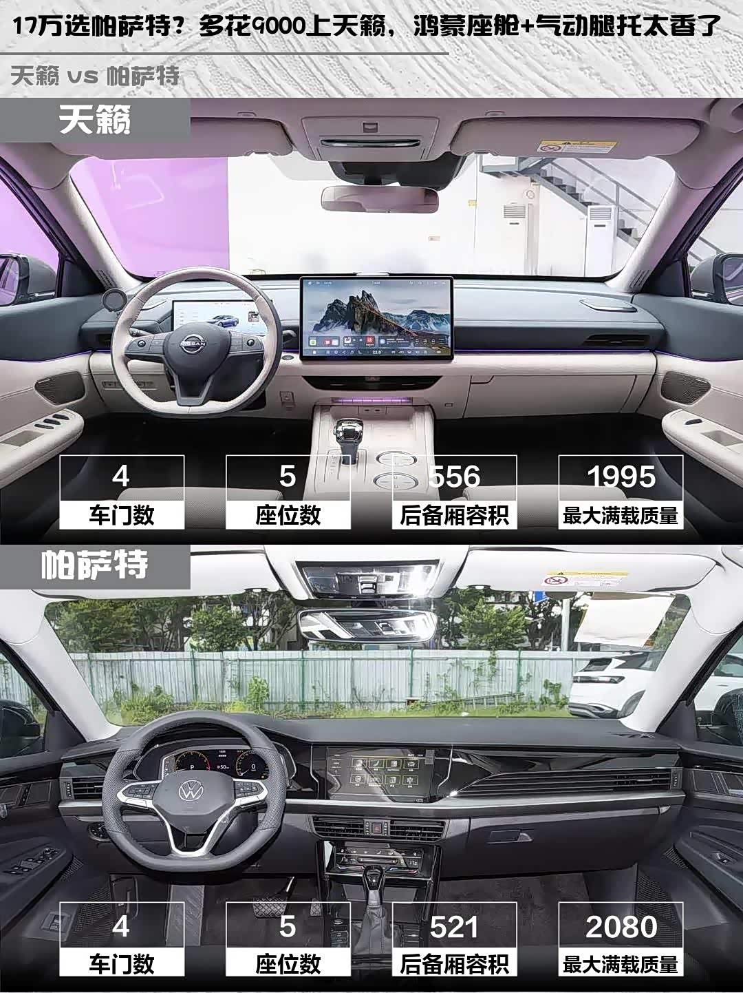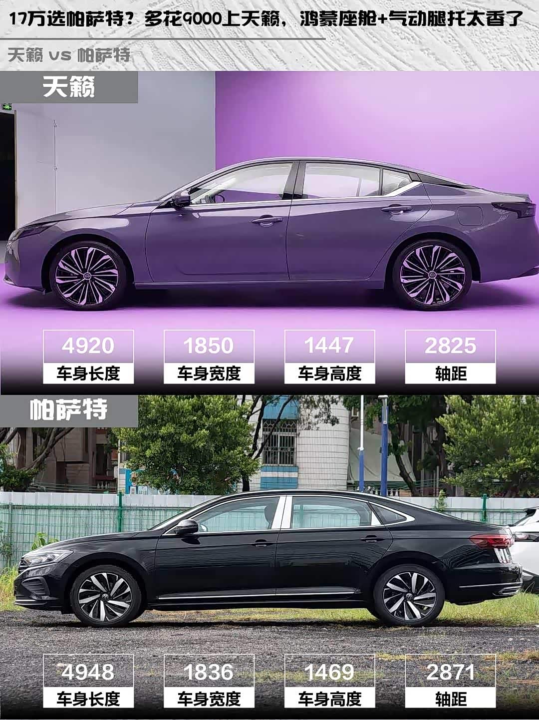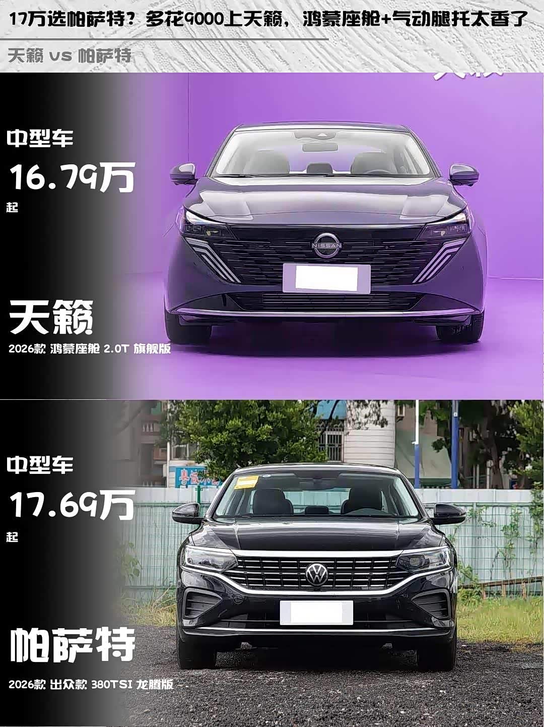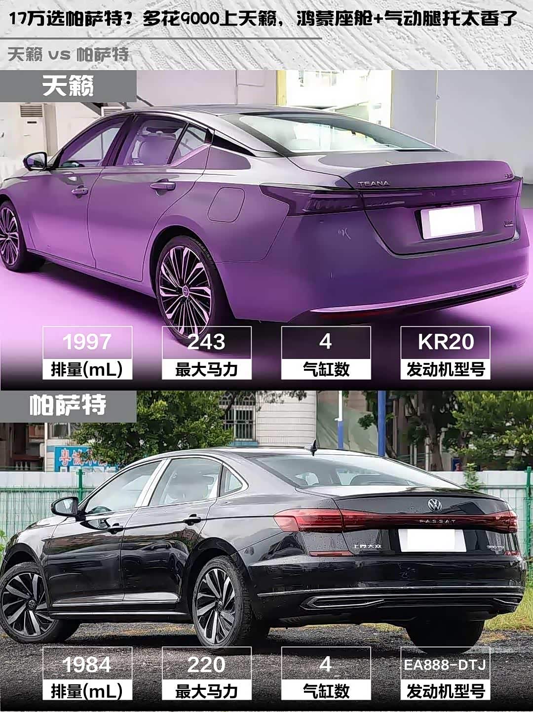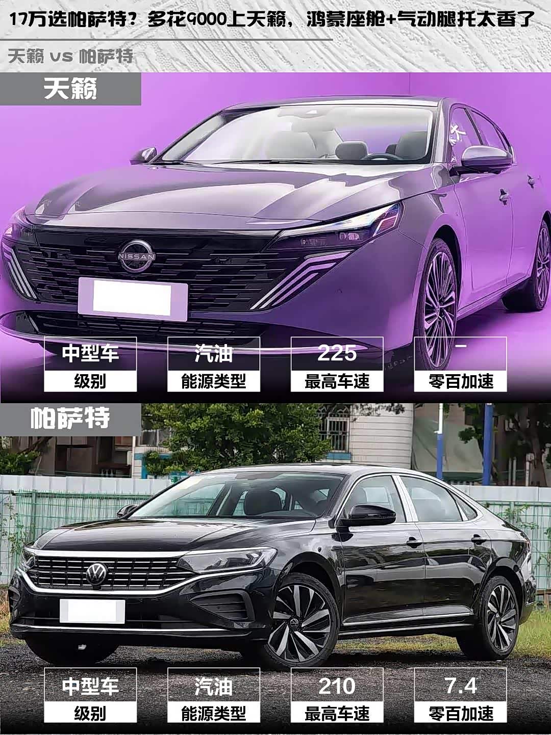 要科技感和舒适选天籁(16.79万还送终身保养),看重空间和动力选帕萨特(17.69万但优惠大)。个人觉得天籁更适合家庭用户,帕萨特则偏商务属性。