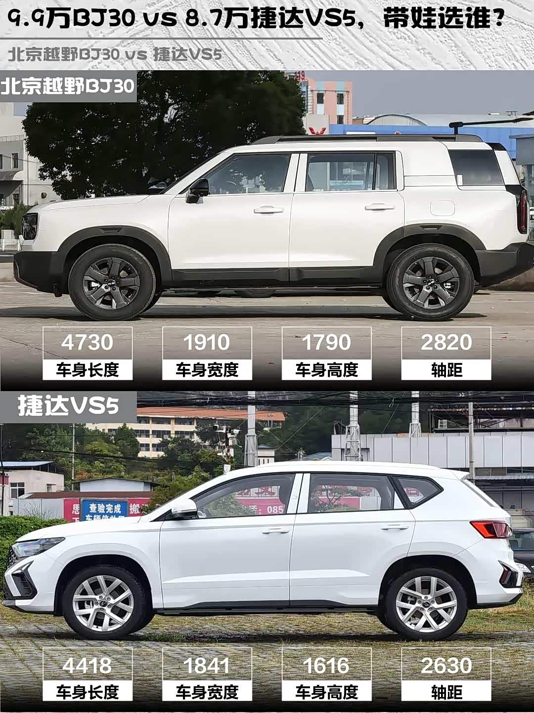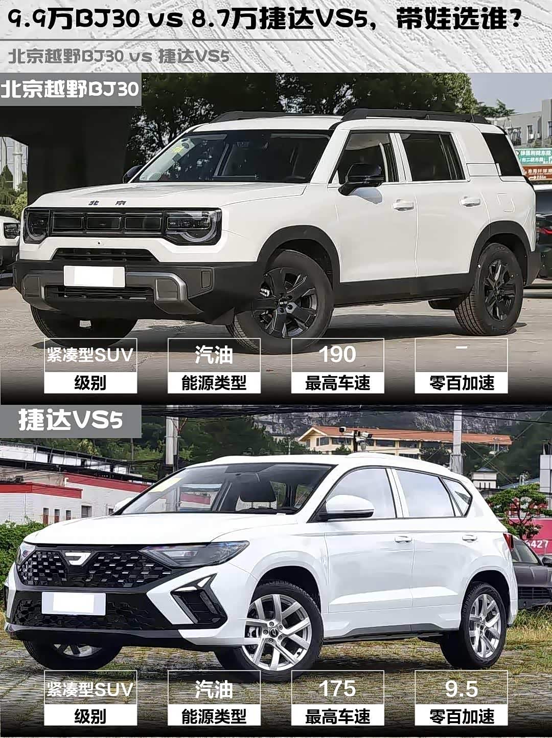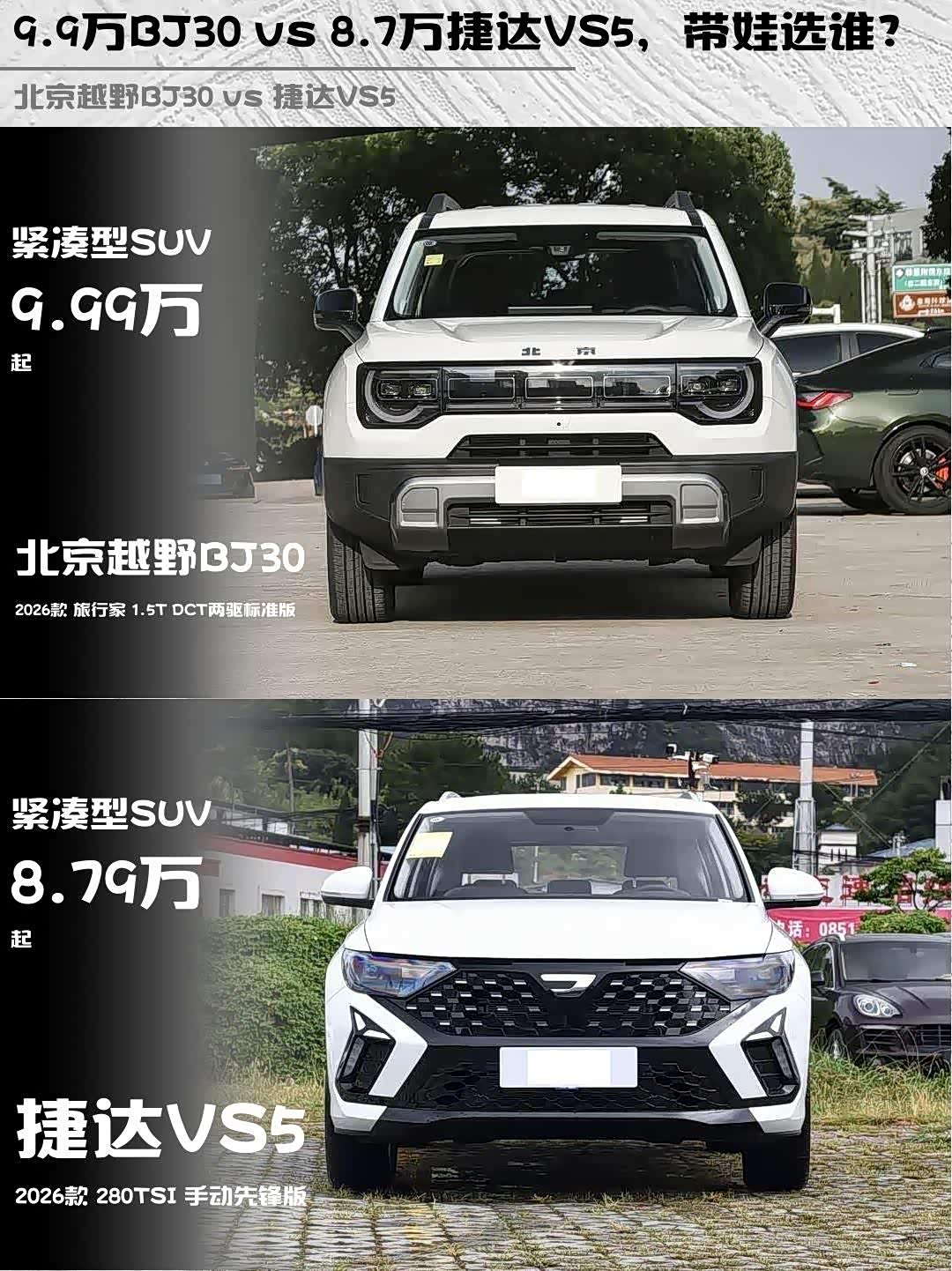 最近后台好多兄弟在问10万级SUV怎么选,尤其是 北京越野BJ30(参数|询价)和捷达VS5这两款热门车🔥 今天直接拿2026款 BJ30旅行家1.5T DCT两驱标准版(9.99万)和捷达VS5 2026款280TSI手动先锋版(8.79万)来场硬核对比,看完你就知道该冲哪台了!