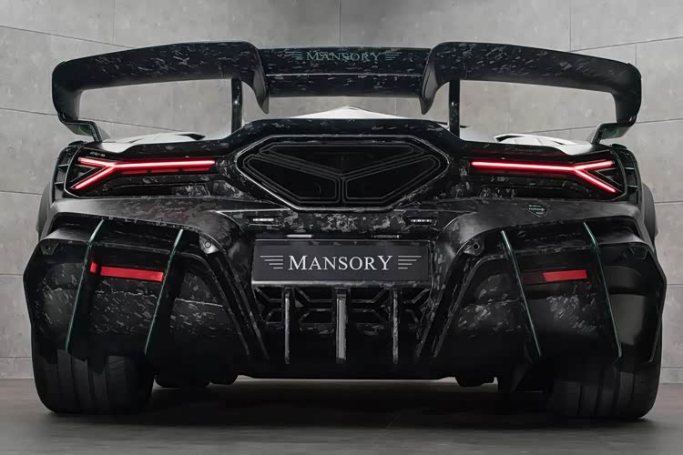 侧面造型方面,车身依然是非常典型的超跑风格,溜背式的车身搭配低趴的姿态带来了出色的运动感;前后翼子板位置都配备有风刃以及导流槽,搭配侧裙部分的套件能够进一步提高空气动力学表现;轮毂采用了多幅式熏黑造型,而且是碳纤维材质,前轮尺寸为21英寸,后轮尺寸则是22英寸。