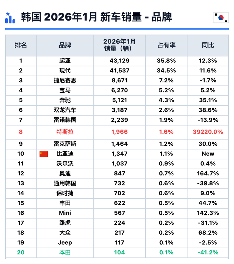 特斯拉和比亚迪2025年在韩国表现出色,2026年的开局也非常好,都保持在前十榜单。仅仅凭 元Plus(参数|询价)和海狮7两款车型,比亚迪2026年1月的销量去到了1,347 辆。整体排名第10,进口车中排名第5。比起在这个市场深耕多年的沃尔沃和奥迪等传统汽车品牌来得更积极。沃尔沃销量为1,037辆。奥迪则为847辆。特斯拉在上个月的销量更是去到了1966辆。整体排名第8,进口车中排名第3。可以看到特斯拉和比亚迪正在重塑韩国进口车市场格局。对本土车企也造成了强的冲击。