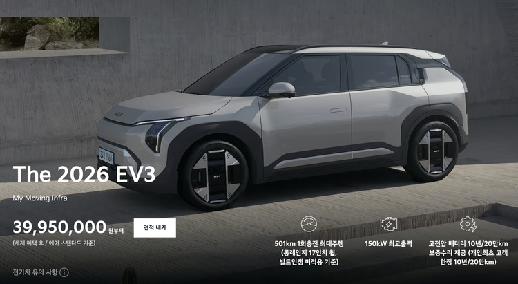 同级的起亚 EV3在2025年上市的时候官方起售价大约是4,208万韩元。为了应对竞争已经调整到3,995万,折合人民币大约是19万。价格高出一大截。