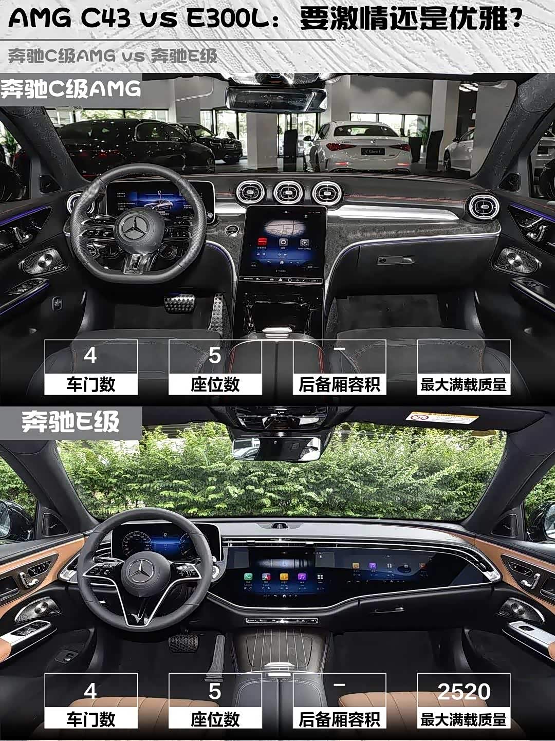 内饰上,AMG C 43的11.9英寸中控屏+夜店风氛围灯,战斗气息拉满,真皮打孔座椅和AMG专属档把让人热血沸腾!E 300 L则是14.4英寸大联屏+64色氛围灯,木纹饰板和柏林之声音响,豪华感直接拉满,晚上开车就像在星际穿越🌌。
