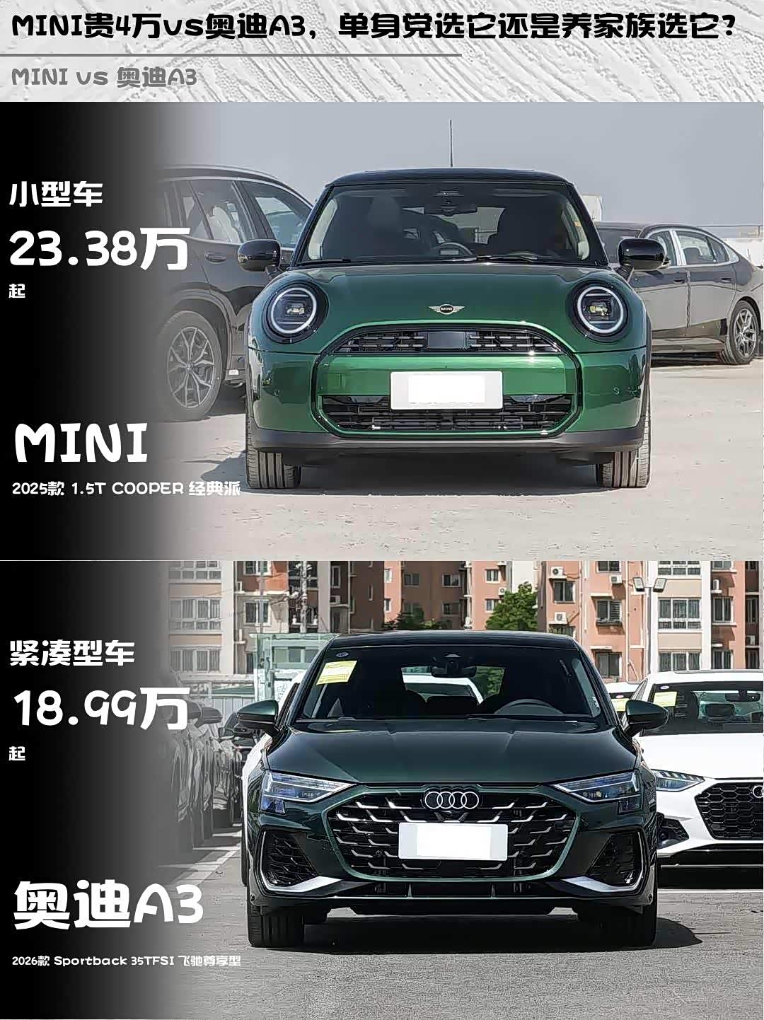 MINI 23.38万比A3贵了4万多,但考虑到MINI三年保值率比A3高5%左右,长期持有成本其实相差不大。如果预算有限又想要豪华品牌,A3的终端优惠确实诱人~
