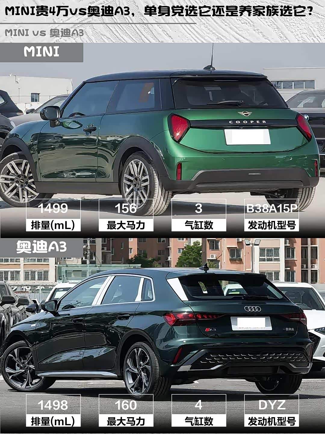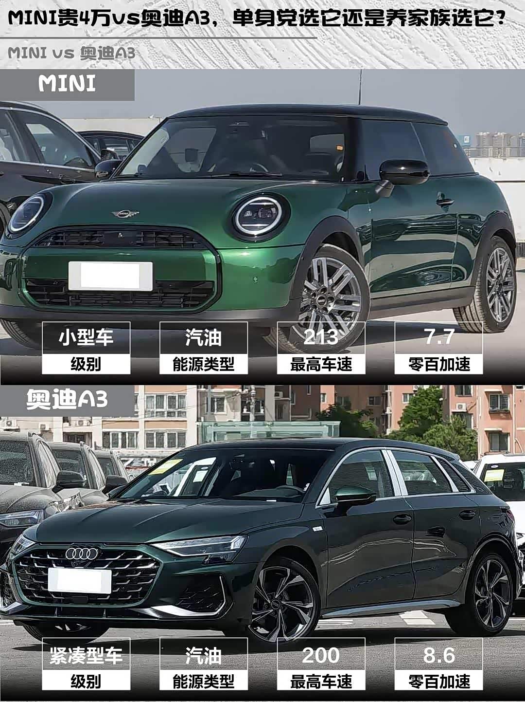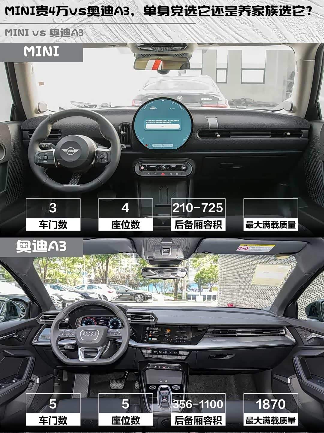 总结来看:要驾驶乐趣和回头率选MINI,要实用配置和家用属性选A3。个人觉得MINI更适合单身或小情侣,A3则兼顾了家庭使用场景。你们会pick哪款呢?