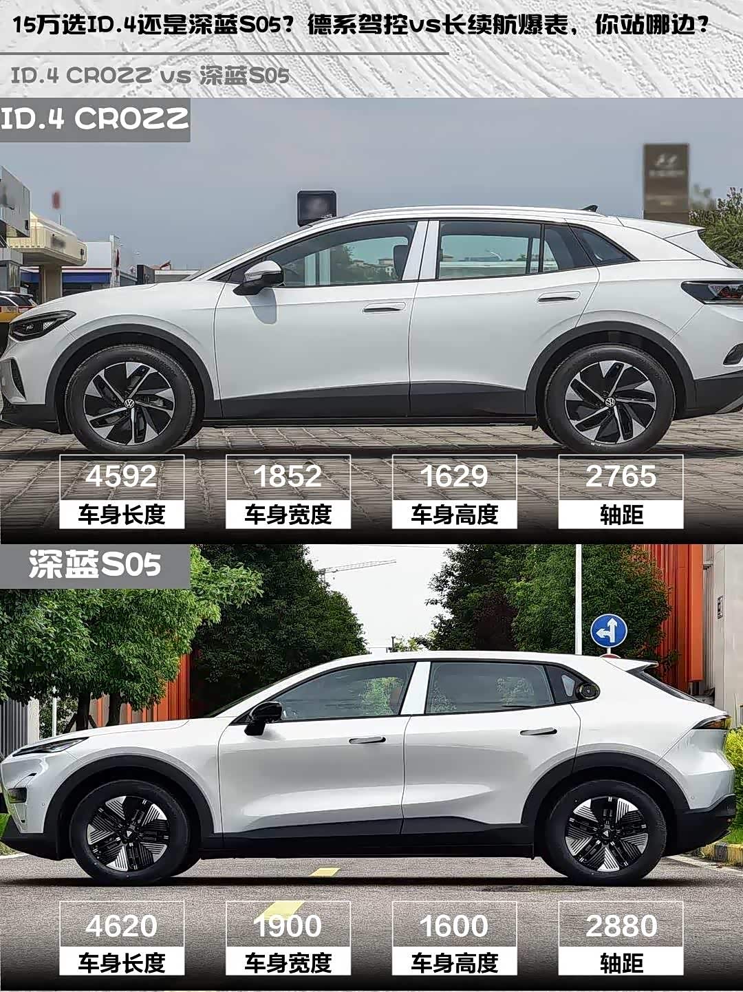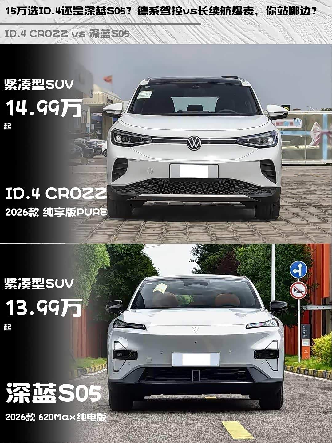 最近在选15万级纯电SUV的朋友看过来!今天深度对比两款热门选手—— ID.4 CROZZ(参数|询价) 2026款纯享版PURE(14.99万)和深蓝S05 2026款620Max纯电版(13.99万),实测干货分享给你们~🔍