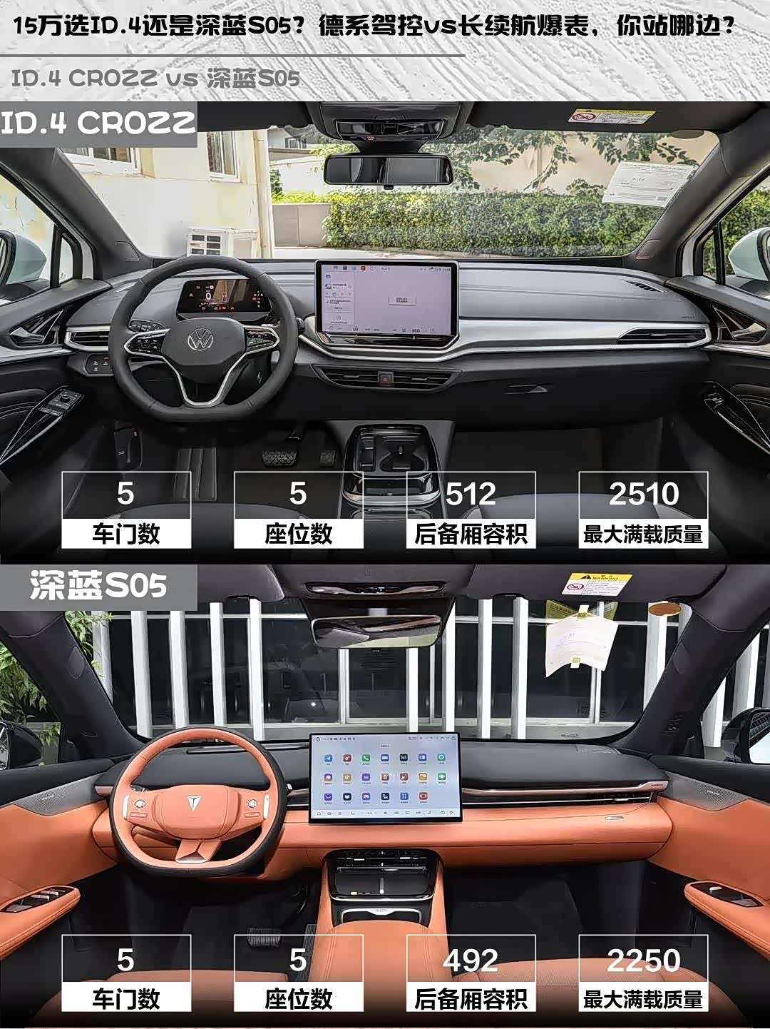要德系驾控+精准续航选ID.4 CROZZ,14万级配宁德电池性价比超高;追求长续航+智能体验选深蓝S05,620km续航+3C快充确实香。个人觉得ID.4适合技术控,深蓝更适合数码爱好者,你们会pick谁?