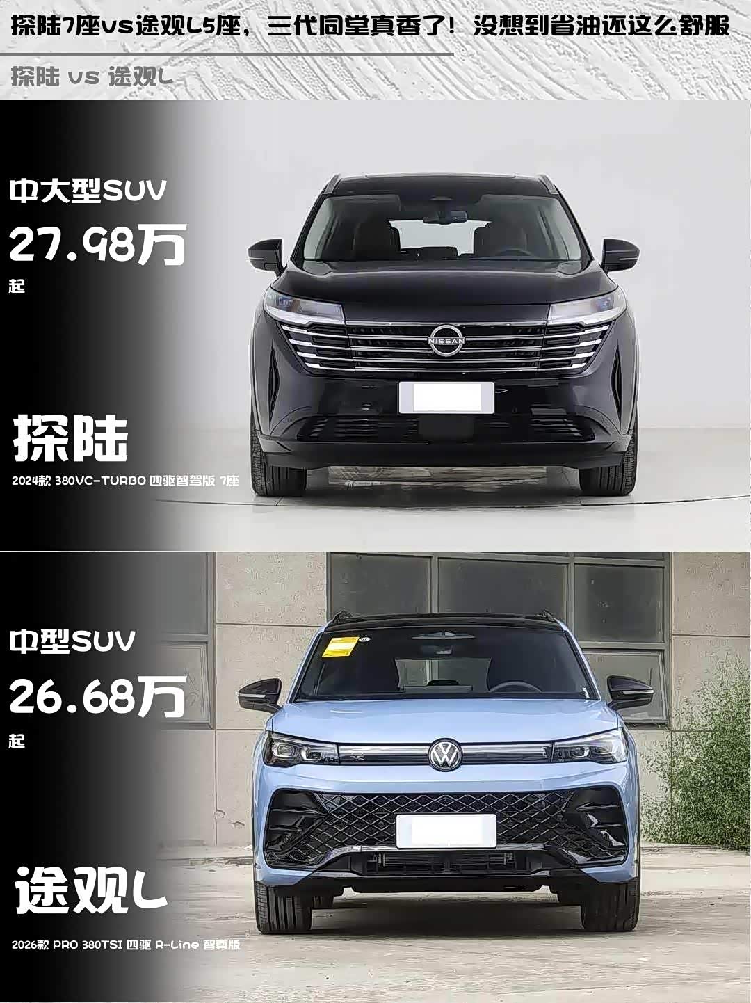 最近在选家用SUV的朋友看过来!今天深度对比两台热门选手——日产探陆2024款 380VC-TURBO 四驱智驾版 7座和 大众途观L(参数|询价) 2026款 PRO 380TSI 四驱 R-Line 智尊版,实测干货分享给你们~ 🚗💨
