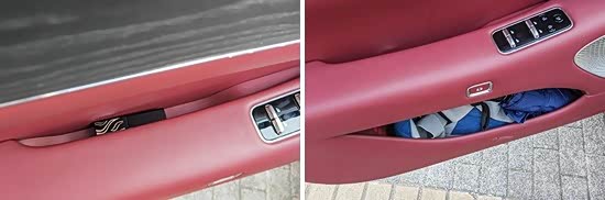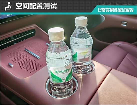 对于车内使用空间的测试,只针对前排触手可及的空间,不包括手套箱、中央扶手箱等需开启的空间。测试方法是将以下固定物品全部放置在前排的各个储物空间内,通过固定物品的放置情况来判断车辆储物空间的表现。测试选定的固定物品为:2瓶常规大小的矿泉水、1部大屏手机、1支口红、1个挎包、1副墨镜、1把折叠雨伞以及1包常规尺寸的抽纸。