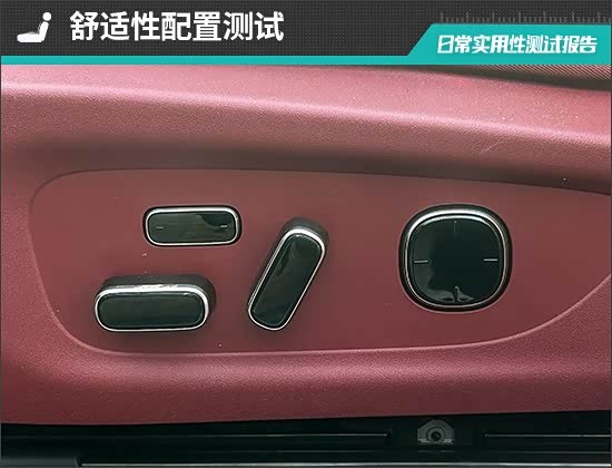座椅方面,评测车前排座椅调节按键位于座垫侧面,调节按键位置合理,操作便捷。此外,评测车驾驶位和副驾驶位座椅配备三组电动座椅记忆功能;同时,前排和后排座椅提供加热、通风和按摩功能,且驾驶位座椅还配备头枕扬声器,舒适性表现出色。