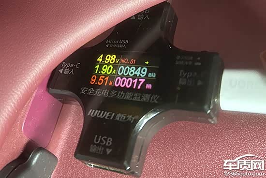 此外,我们对USB接口进行了测试。其中,前排USB Type-C接口的充电功率为9.51W,电压为4.98V,电流为1.9A。后排USB Type-C接口的充电功率为9.27W,电压为4.86V,电流为1.9A。