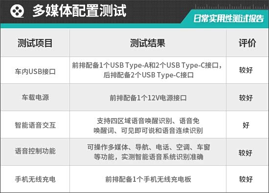 评测车配备5个USB接口,其中,前排配备1个USB Type-A接口和2个USB Type-C接口,后排配备2个USB Type-C接口,接口布局合理,但后排兼容性不佳。此外,前排中控台下方还提供1个12V电源接口,能够满足车内乘客多种电子设备的用电需求。