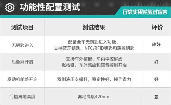 评测车配备全车无钥匙进入功能,但因为只提供了卡片钥匙,部分功能受限,因此没能测试无钥匙进入的实际使用表现。卡片钥匙的感应区位于左侧外后视镜处,操作方便,实测感应解锁和上锁的成功率很高。