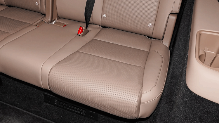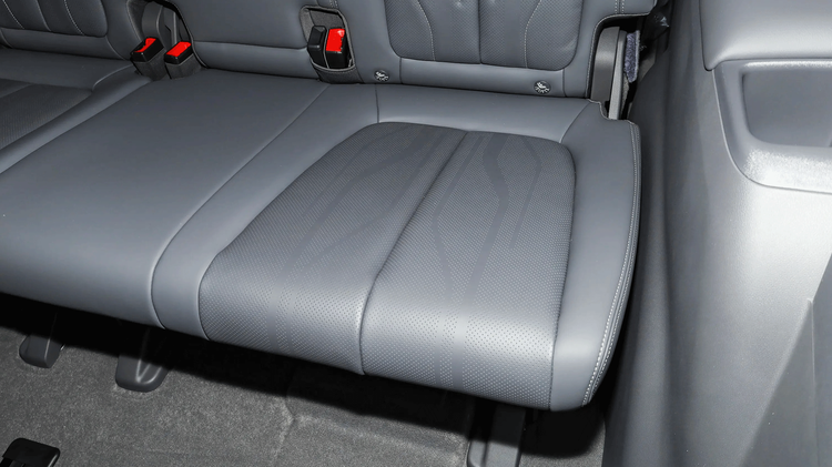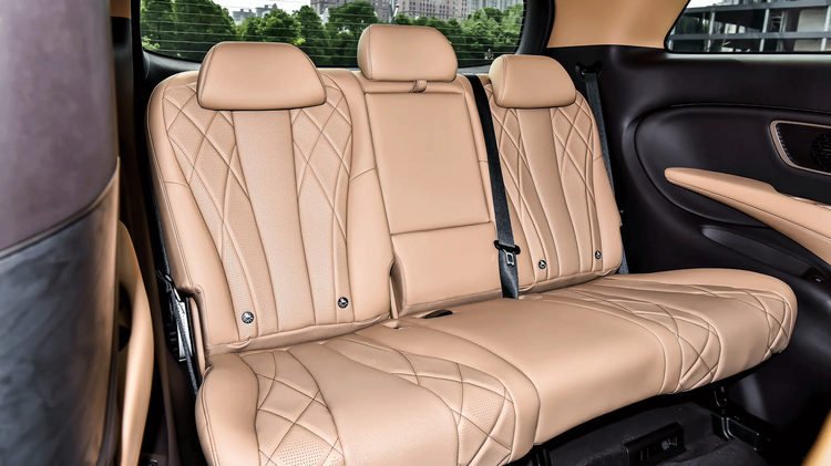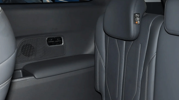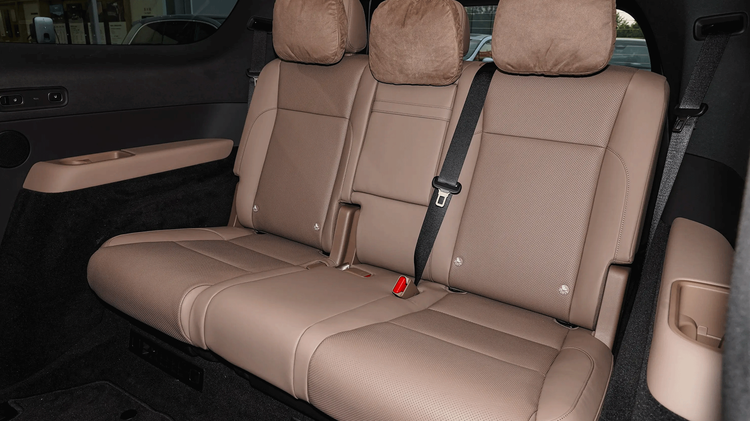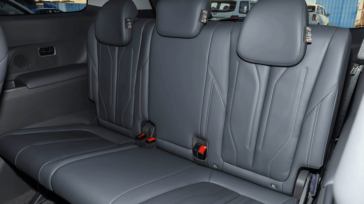 实测其第三排坐垫长度500mm,坐垫高度380mm,达到行业标杆水平,对腿部的承托性极佳,第三排横向总宽度1330mm,空间表现优于腾势D9 EV,两名成年人乘坐时宽敞舒适,但三人乘坐依然还是会仅略感拥挤。
