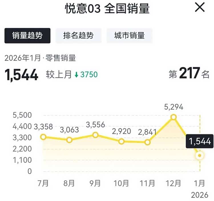 悦意03在2026年1月份的销量为1544辆,相比2025年12月份的销量5294辆,环比下滑70.83%。