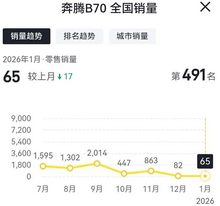 奔腾B70在2026年1月份的销量为65辆,相比2025年12月份的销量82辆,环比下滑20.73%。同时相比2025年1月份的销量2541辆,同比下滑97.44%,同比、环比双双下滑。