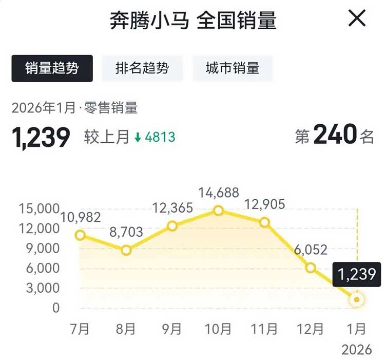 比如2026年1月份,奔腾小马的销量为1239辆,相比2025年12月份的销量6052辆,环比下滑79.52%,同时相比2025年1月份的销量5316辆,同比下滑76.69%,同比、环比双双下滑。