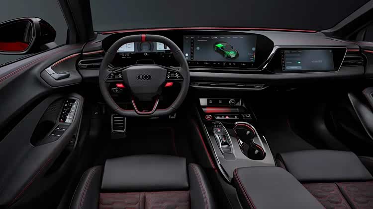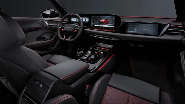 另外就是左后翼子板处的充电接口,由于明显的宽体效果,形成了向上开口的造型,更增添了一份特殊的气质。内饰部分当然不会有多少悬念,以新一代奥迪A5为基础打造,双联悬浮式屏幕向驾驶侧微微偏转,并带有弧度,副驾驶侧娱乐屏层次感丰富的中控台面,环抱式的布局等元素不会缺席Hud得到实装,当然都是满配的节奏,拨杆式换挡,杯架,手机充电面板等元素不会缺席,保留了实体一键启动按钮,刺激着驾驶者的运动神经。平底方向盘有翻毛皮覆盖,还有换挡拨片和功能按键,配合一体式运动座椅,显示了RS车型应有的姿态。