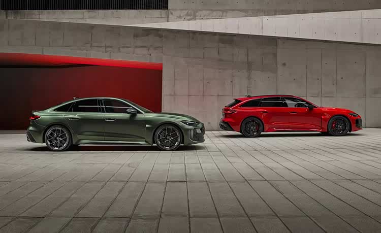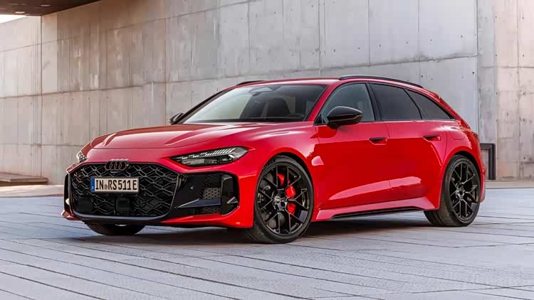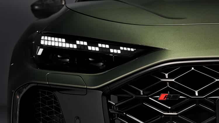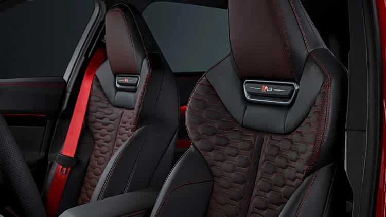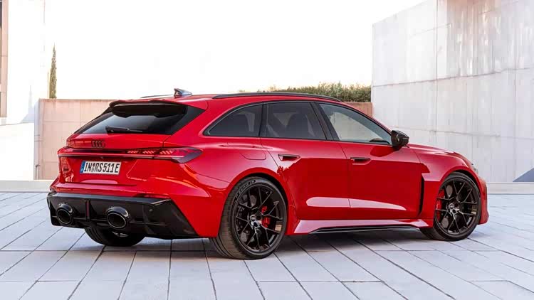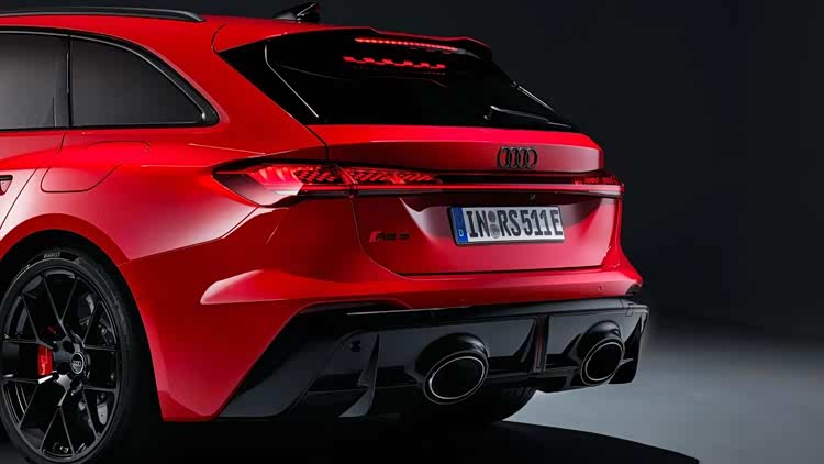 车身侧面分为了Sportback和Avant版本,整体线条轮廓和对应的欧洲版本没有明显的不同,都显得紧凑而运动。当然作为RS车型,碳纤维后视镜,夸张的宽体效果,A柱下方的进气道,突出的侧裙板,大尺寸轮毂,红色刹车卡钳都不会缺席,保持了战斗的姿态。在车尾部分,应该说最为明显的还是宽体效果,官方表示比普通版本A5宽了90毫米,再加上更加低趴的车身,营造出战斗的视觉效果,除此之外,例如贯穿式的尾灯等元素都保持相同,RS系标志性的巨大的双出排气不会缺席,处于偏中间的位置,夸张的碳纤维装饰翘起的尾翼等元素,让整车的设计形成统一。