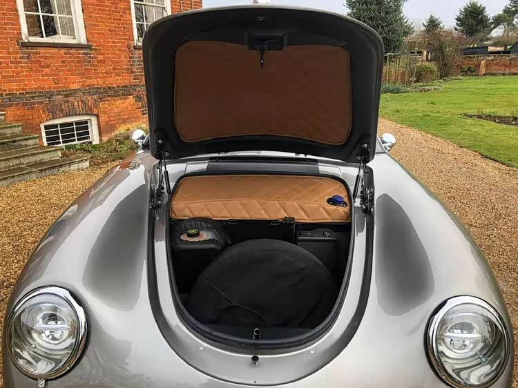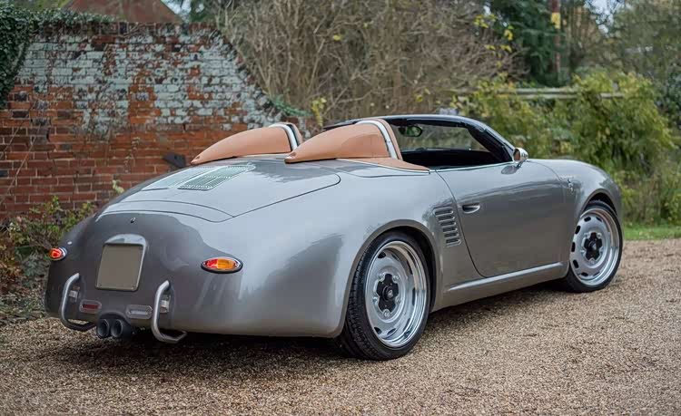 这台复刻版的核心基底,是2005年推出的保时捷987 Boxster S,也有展车基于1996年的986世代Boxster打造,无论选用哪一代基底,整车都会换装定制全玻璃纤维车身,全方位复刻保时捷356 Speedster的经典流线型设计,每一块车身面板都经过重新打造,镀铬装饰条、圆形LED大灯、泪滴状LED尾灯、雕塑感后座椅靠背整流罩,再加上可正常工作的后扰流板,完美还原了经典356 Speedster的标志性设计细节。为了保持纯粹的经典车身轮廓,改装厂还为Boxster标志性的侧进气口定制了遮挡盖板,搭配专属19英寸合金轮毂,保留了原厂的电动软顶敞篷结构,让复古外观下,仍有现代敞篷的实用体验。