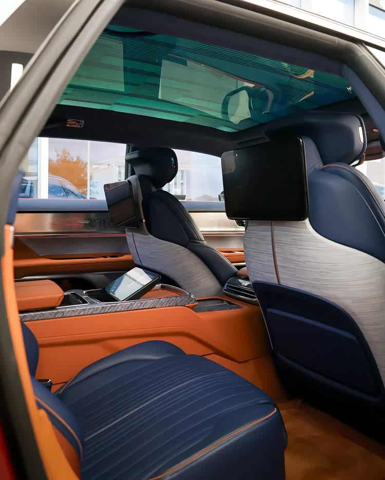 车内采用了极具豪华的设计,中控采用了简约的风格,并且有着层次感,提供55英寸大尺寸的连体屏幕设计,呈现出贯通式的风格,下方采用了11英寸的触控屏幕设计,车顶采用大尺寸玻璃天幕,支持单独调节亮度来遮挡红外线。后排采用了独立的座椅,提供12.6英寸娱乐屏幕,中控还采用了8英寸的触控屏幕造型,极具科技范。
