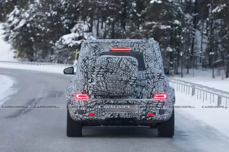 尾部造型方面,车顶配备有小尺寸的扰流板以及高位刹车灯,熏黑的尾灯组造型比较小巧,和现款奔驰G级的风格比较相似;外挂式的小书包也没有缺席,不过内部可能并不是备胎,而是起到了储物空间的作用;尾门应该也是侧开设计,属于硬派风格SUV常见的设计语言;下包围部分的立体感比较强,具体的细节还无法判断。