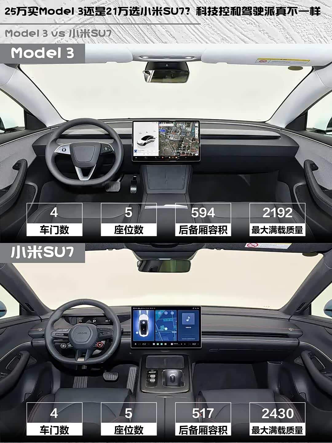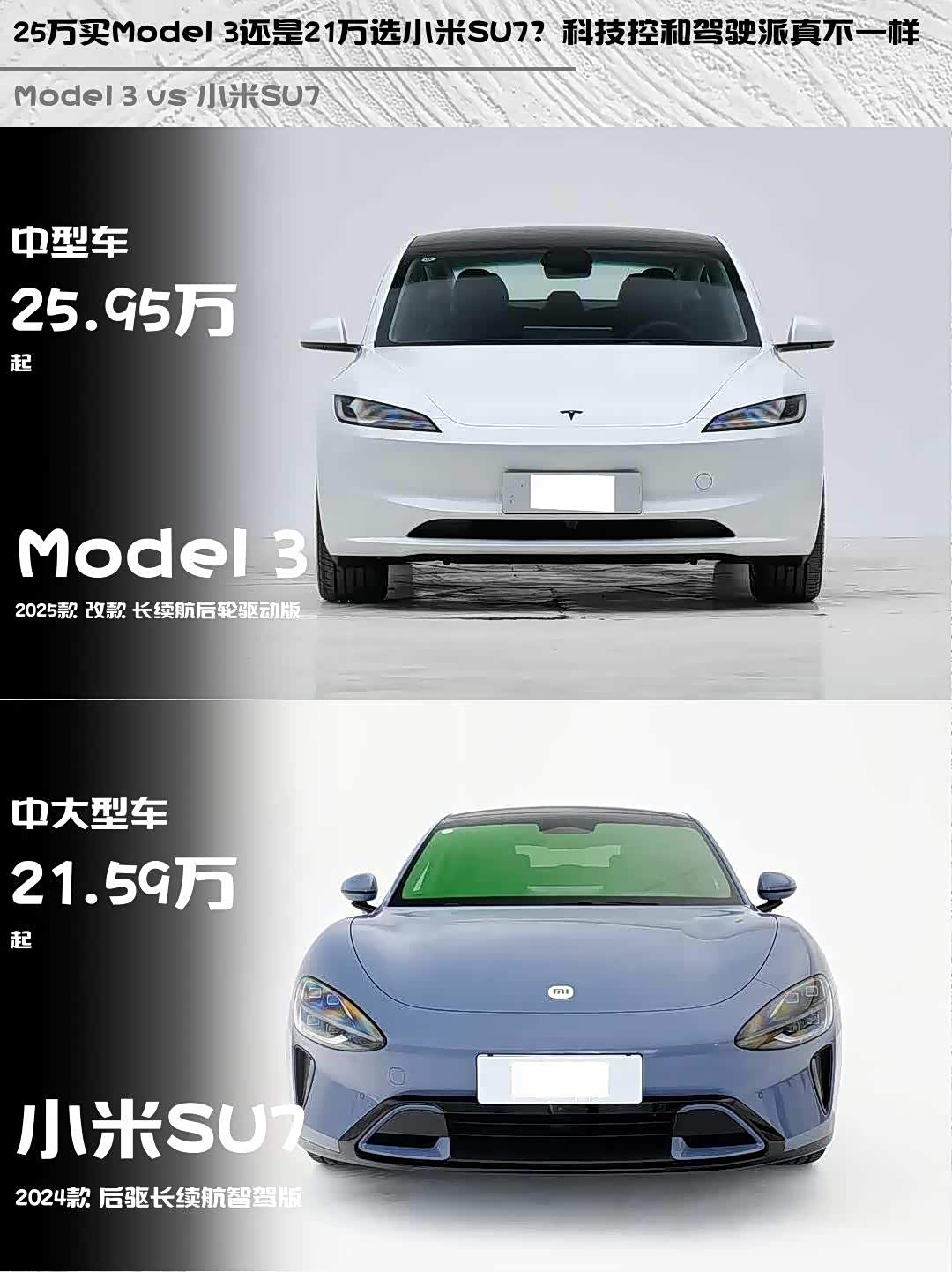 要品牌力和驾驶纯粹感选Model 3,25.95万的价格现在还有免息政策;更看重智能生态和配置堆料的话,小米SU7 21.59万的定价确实香,不过要注意部分选装件需要加价(比如9000元的霞光紫车漆)。