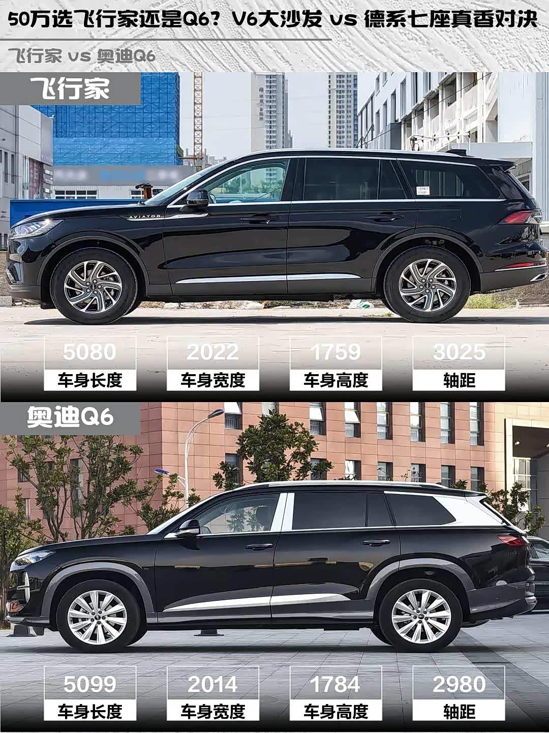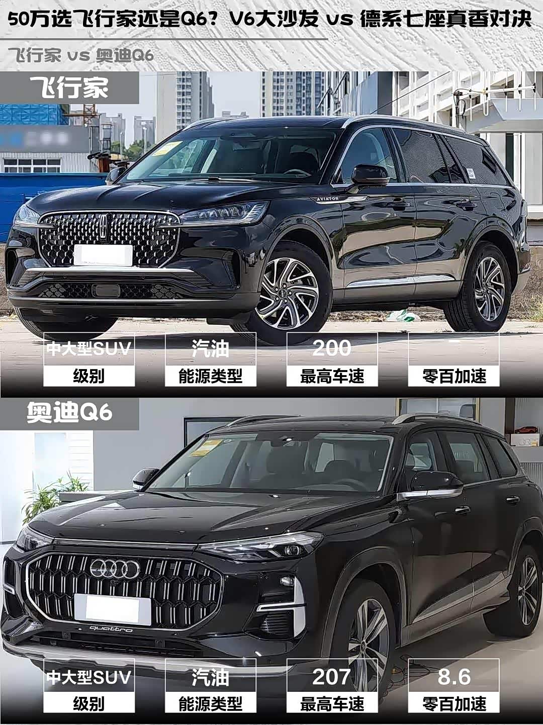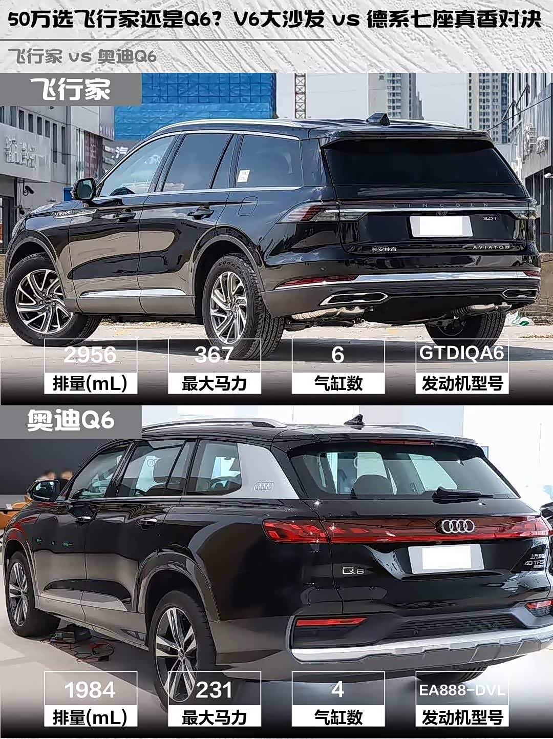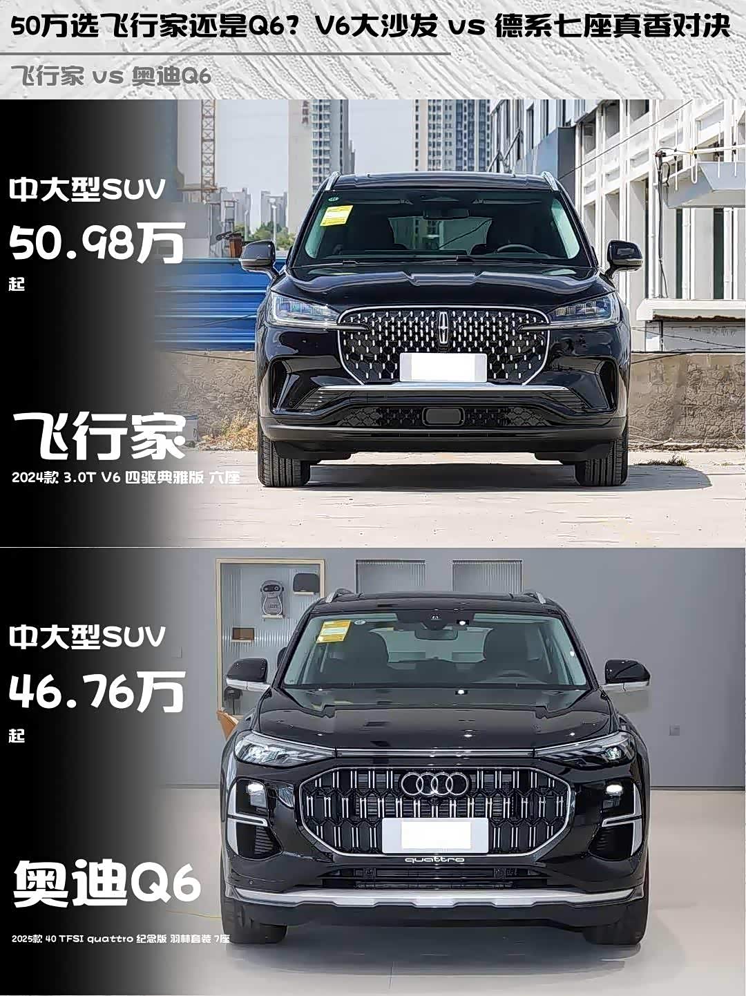 最近在选50万级豪华SUV的朋友看过来!今天深度对比两款热门选手——林肯飞行家2024款 3.0T V6四驱典雅版六座 vs 奥迪Q6(参数|询价) 2025款40 TFSI quattro纪念版羽林套装7座,实测干货分享👇