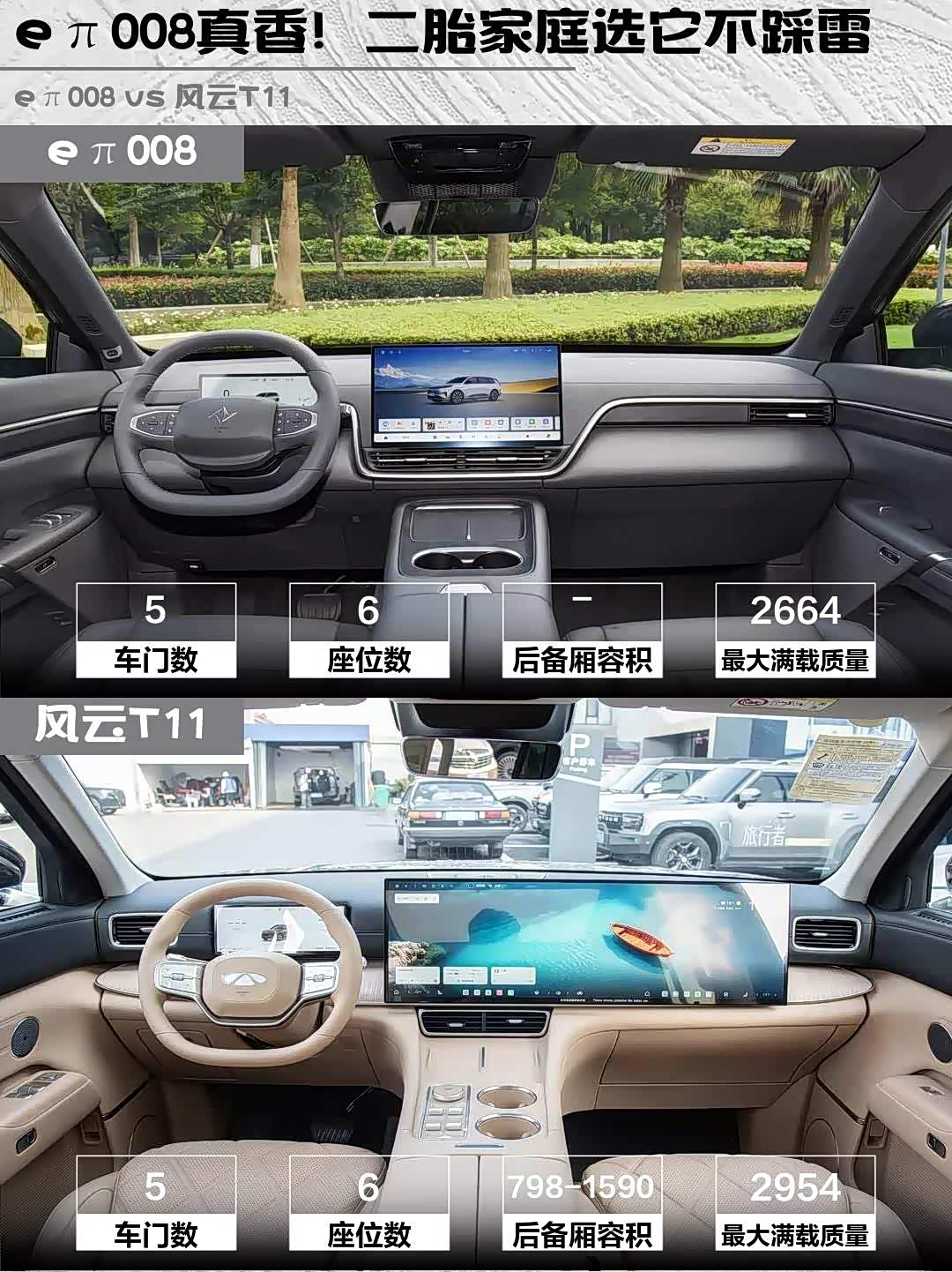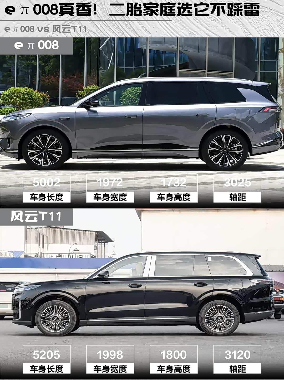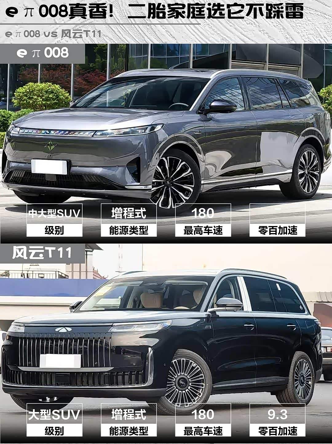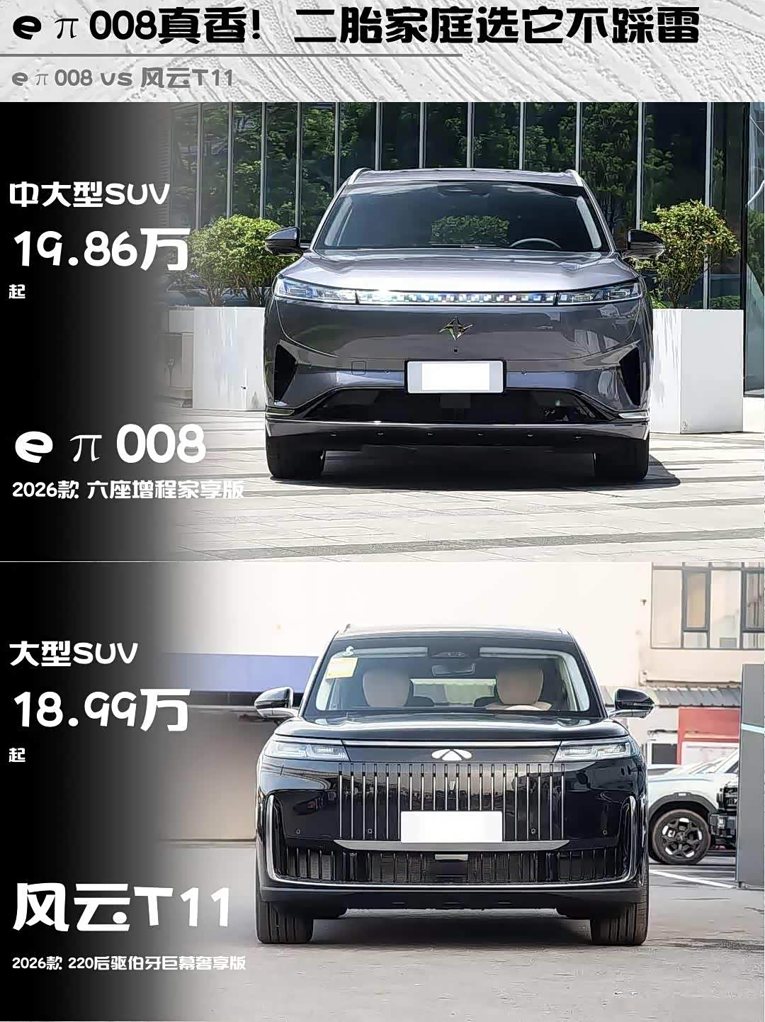 最近在选家用六座新能源SUV的兄弟们看过来!深度对比两款热门选手——eπ008 2026款六座增程家享版 vs 风云T11(参数|询价) 2026款220后驱伯牙巨幕奢享版,实测干货奉上👇
