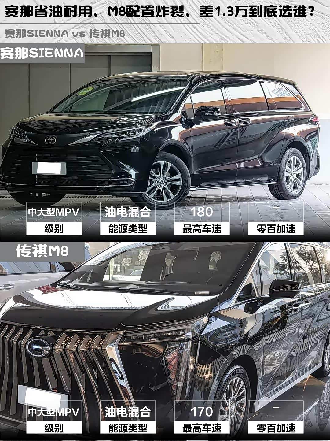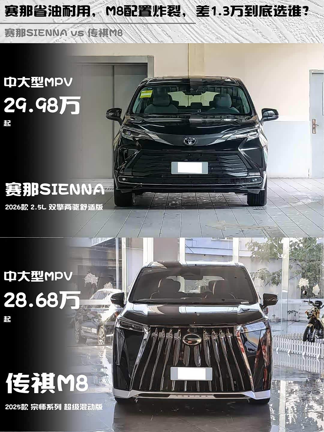 最近在选家用MPV的朋友看过来!🚗 今天深度对比两款热门混动MPV—— 赛那SIENNA(参数|询价) 2026款 2.5L双擎两驱舒适版 vs 传祺M8 2025款宗师超级混动版,实测干货分享给纠结的你👇