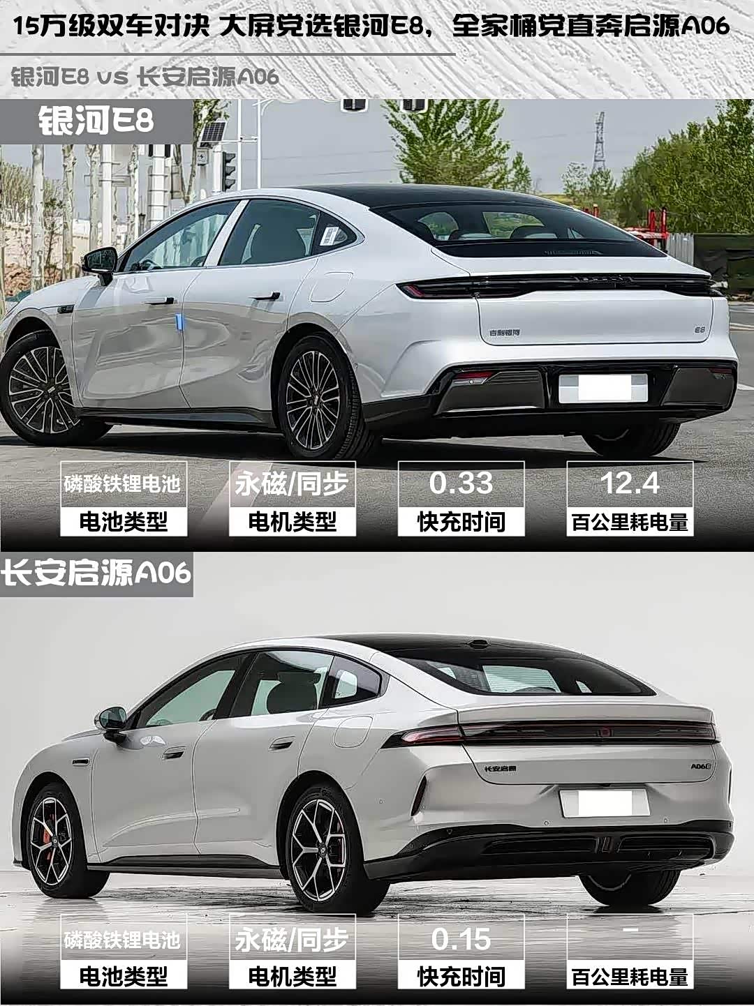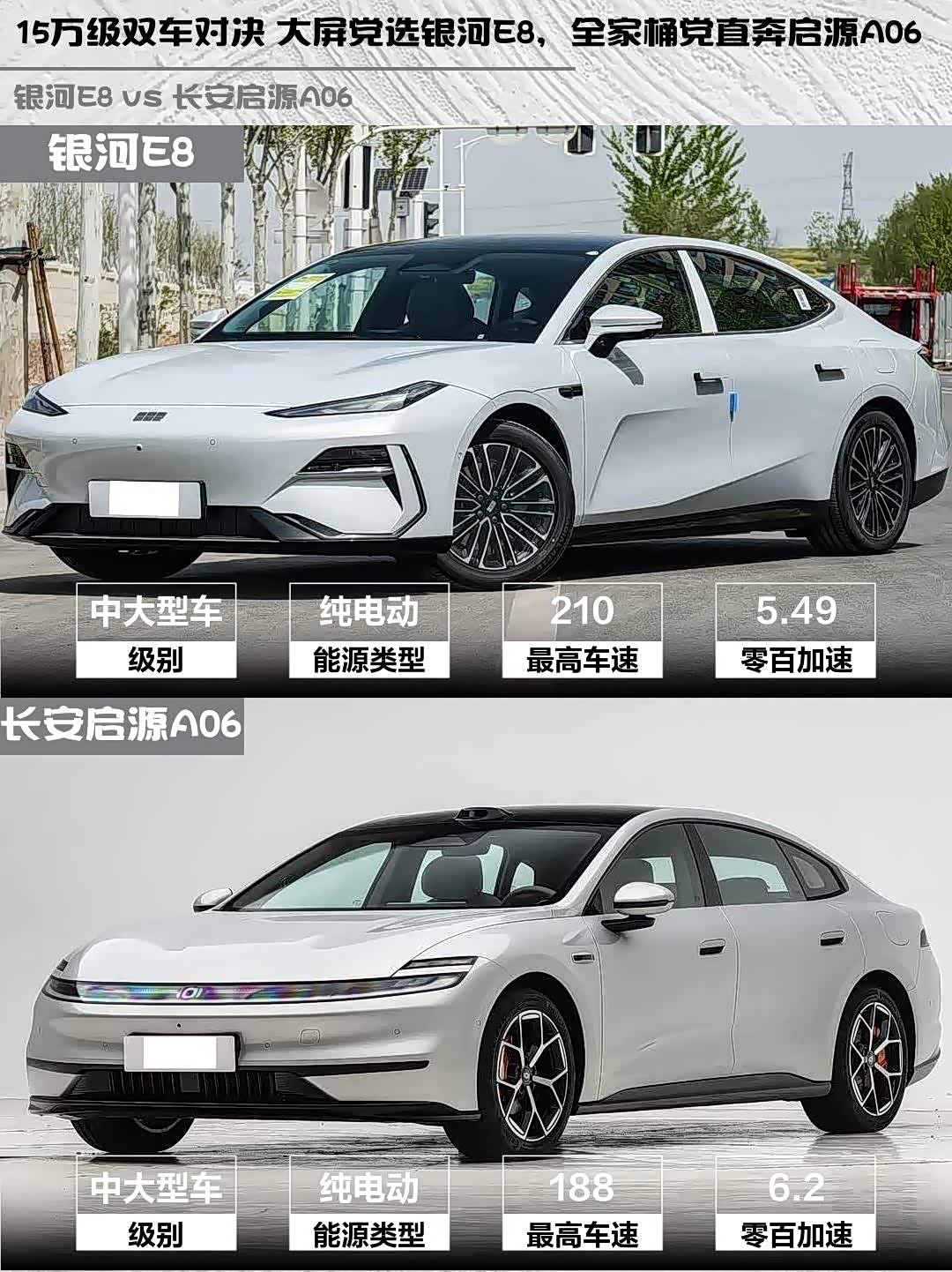 3️⃣ 性能表现:银河E8加速更快(5.49s vs 6.2s),极速更高(210km/h vs 188km/h);启源A06的悬架用料更豪华(前双叉臂+后五连杆)