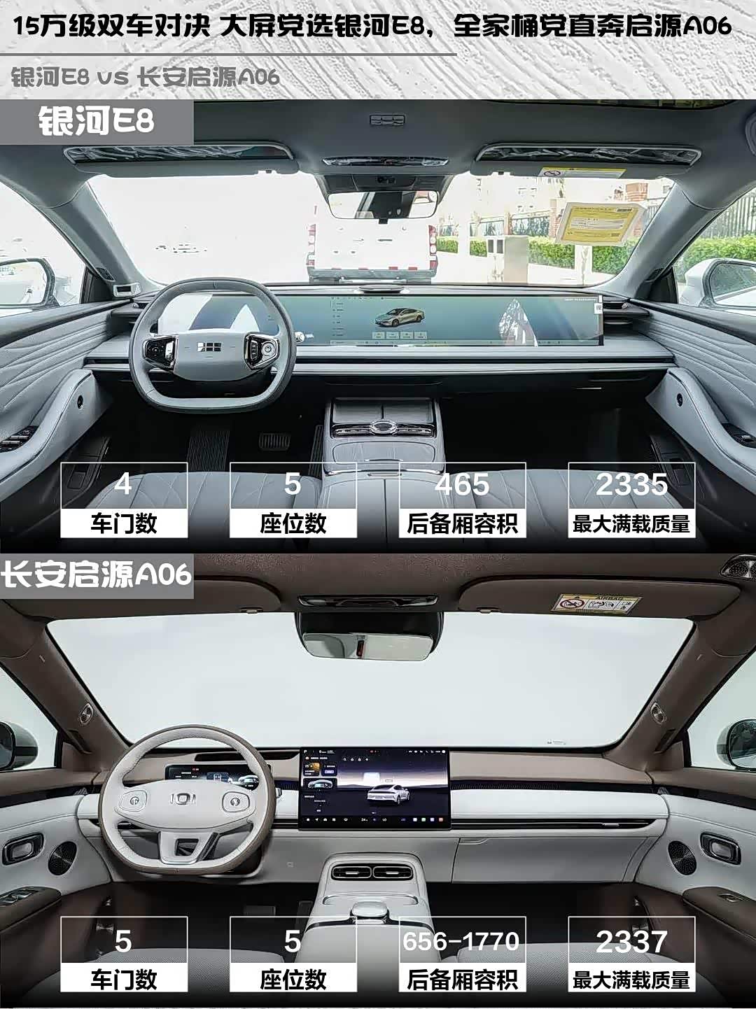 2️⃣ 空间灵活性:启源A06的掀背设计+纯平地台更适合家庭使用;银河E8的溜背造型更运动但后排头部局促