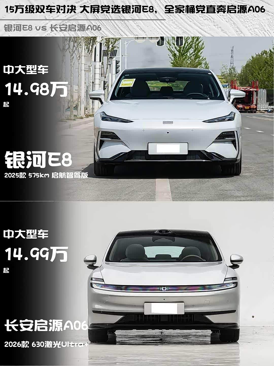 最近在15万级纯电轿车市场纠结了好久,最终锁定了两款热门选手——银河E8 2025款 575km 启航智驾版和 长安启源A06(参数|询价) 2026款 630激光Ultra+。深度试驾后,发现这两台车性格差异还挺明显的,分享下我的真实体验感受!✨