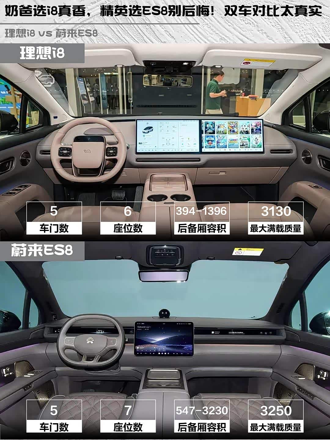 理想i8主打6座独立布局,三排座椅全电动调节+加热功能,实测第三排坐180cm成人还能跷二郎腿👨👩👧👦 后备箱容积394-1396L,放倒后能当小货仓。而蔚来ES8是标准7座设计,后备箱基础容积547L更大,但第三排更适合短途乘坐。i8的"每个座位都是VIP"理念对多孩家庭更友好~